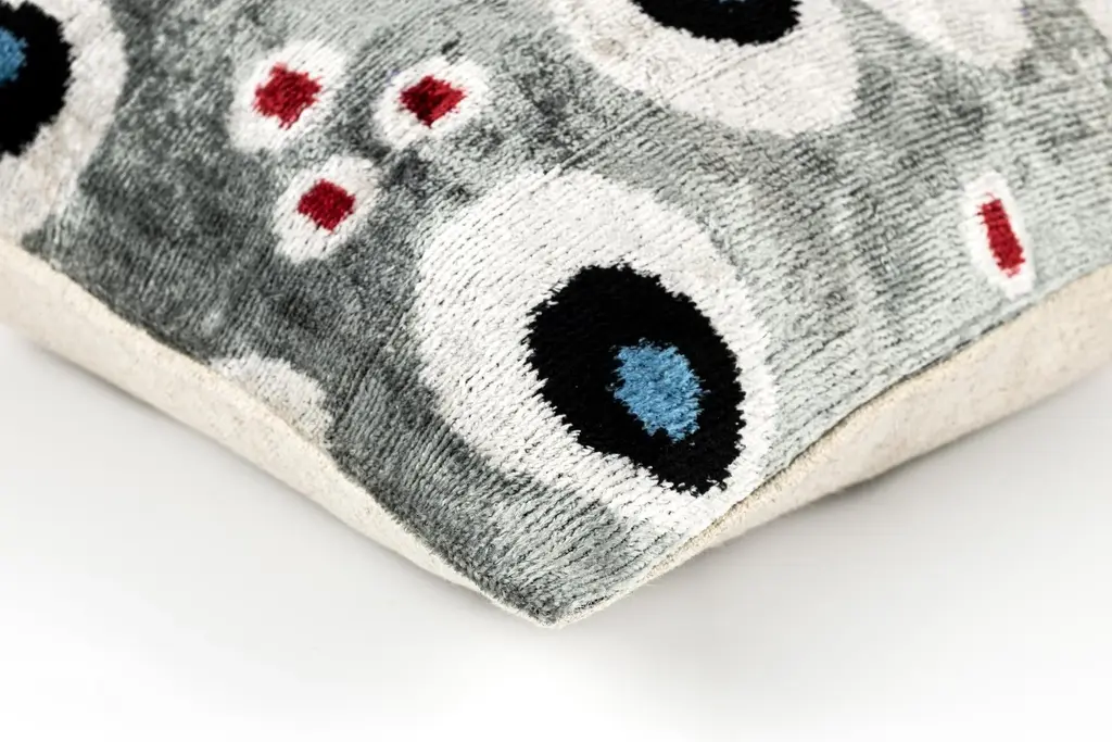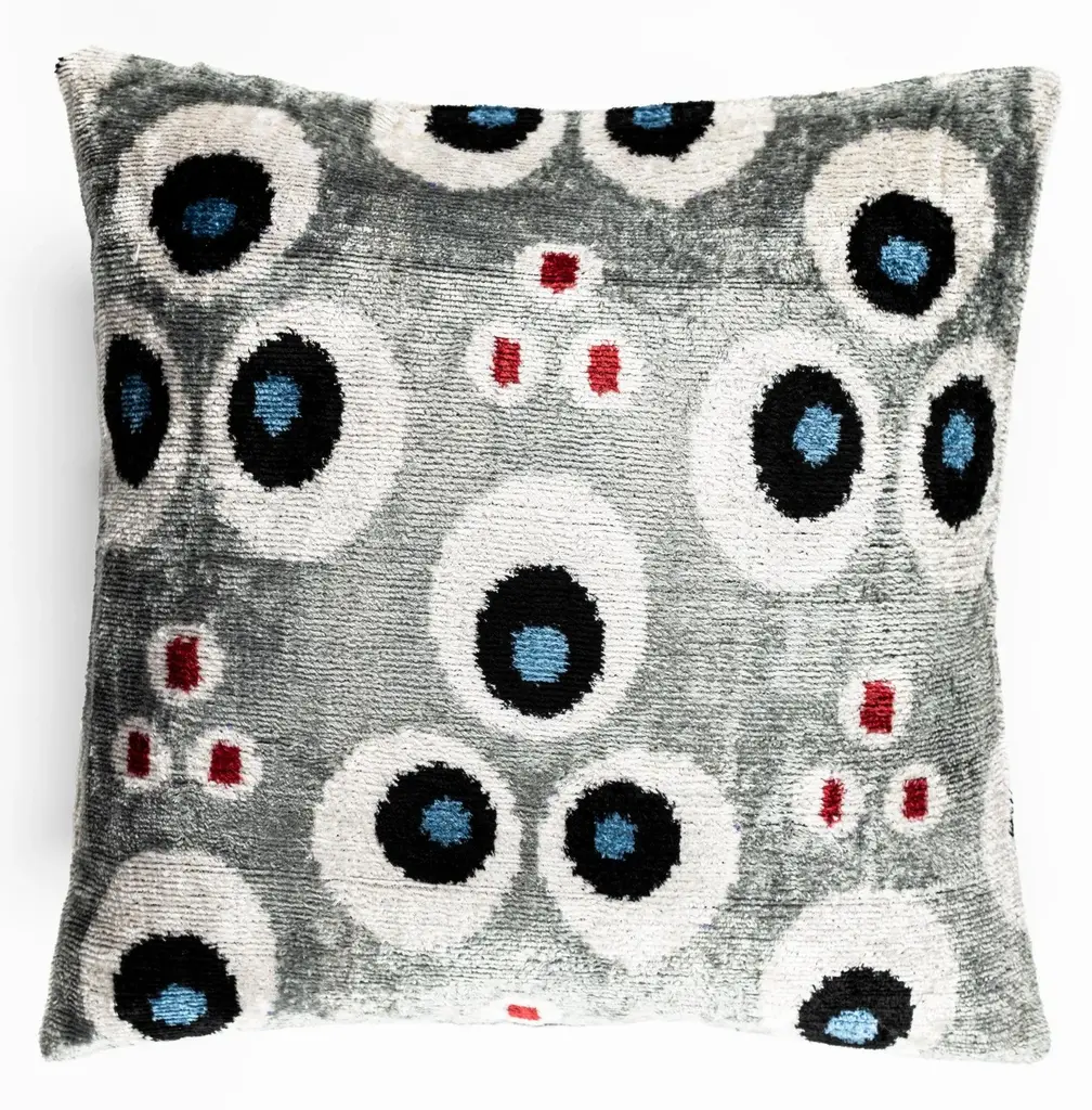 "Unique Design: Handmade 16x16-inch throw pillow featuring a bold gray background with geometric patterns in blue, black, red, and white. Luxurious Velvet: Crafted from organic vegetable-dyed velvet for a soft and premium feel. Ultimate Comfort: Comes with a premium down feather insert for a plush and cozy experience. Versatile Style: Ideal for modern, minimalist, or eclectic home decor themes. Artisan Craftsmanship: Handmade with attention to detail, sustainability, and eco-friendly materials. Bring a modern and artistic flair to your home with this handmade 16x16-inch velvet throw pillow. Featuring a sophisticated gray background adorned with bold geometric patterns in blue, black, red, and white, this pillow is the perfect statement piece for any room. Made from organic vegetable-dyed velvet, the pillow offers a soft, luxurious texture that complements its striking design. The premium down feather insert ensures exceptional comfort and support, making it both stylish and functional. Whether placed on a modern sofa, a minimalist chair, or an eclectic bedspread, this pillow adds a unique charm and character to your space. Handcrafted with care and sustainable materials, this pillow reflects timeless craftsmanship and eco-conscious values, making it a thoughtful addition to your home decor."