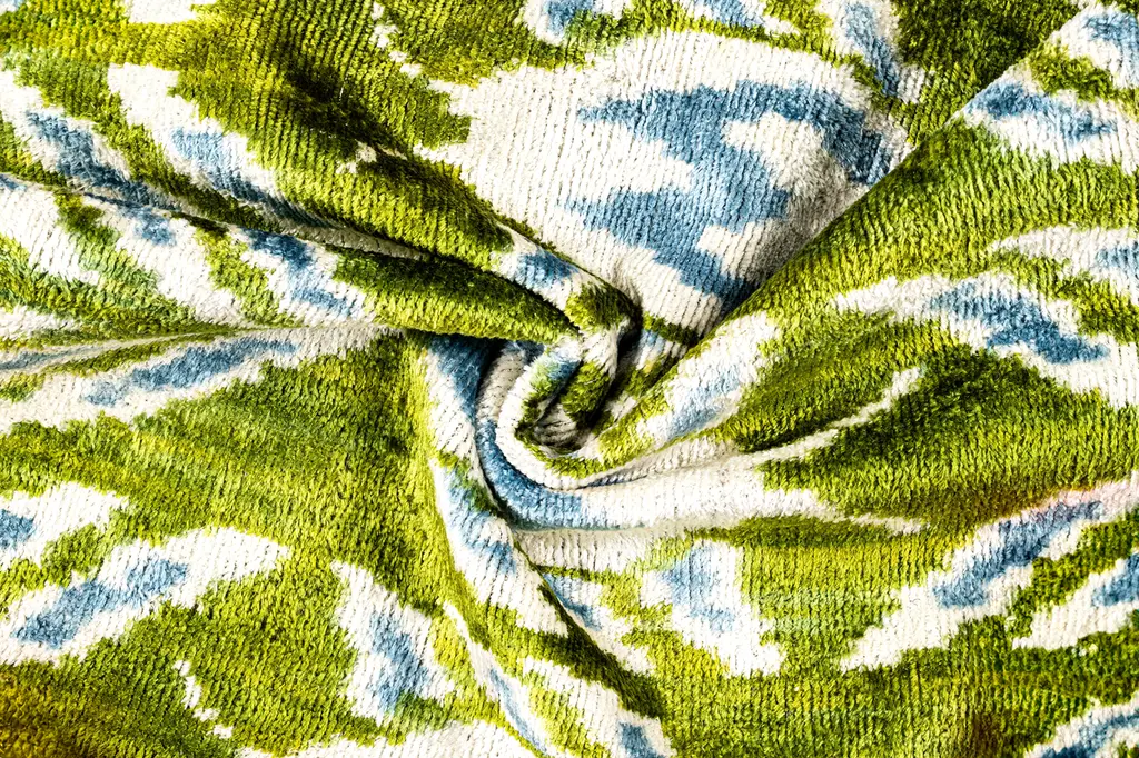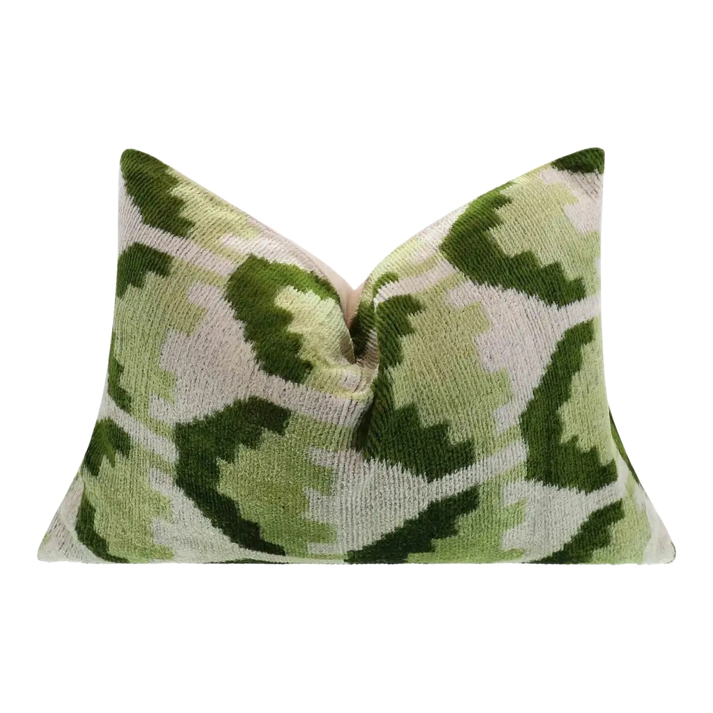Handmade 16x16 Velvet Throw Pillow – Green, Blue, And White Ikat Pattern With Down Insert