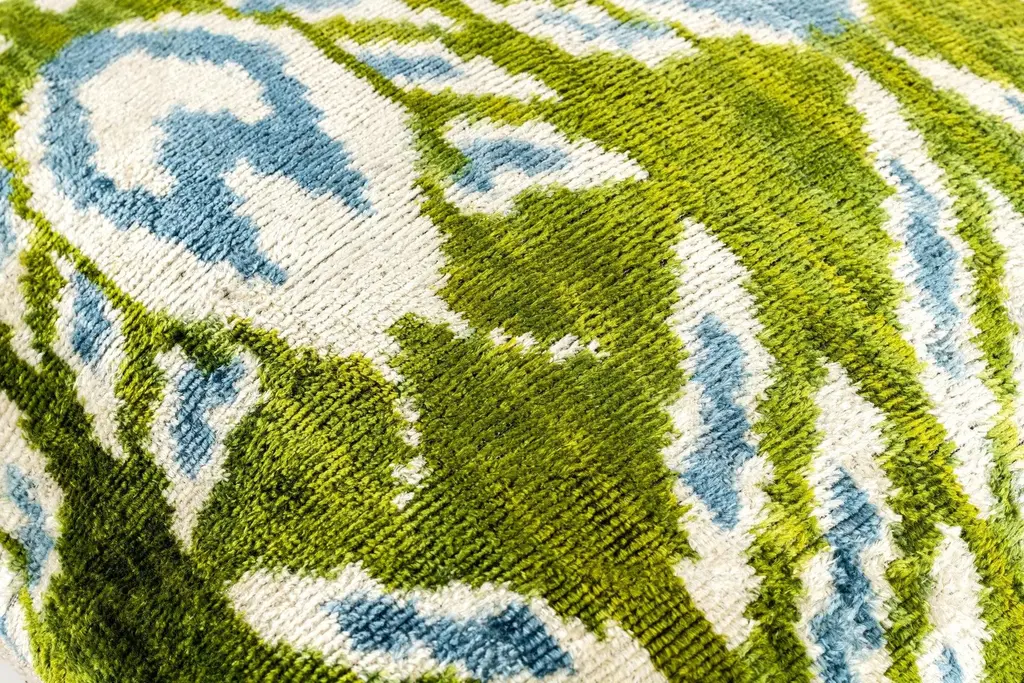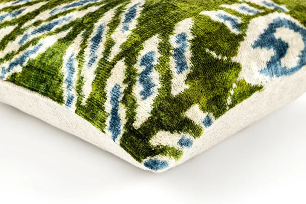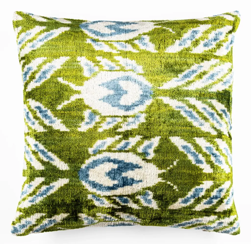 "Striking Design: Handmade 16x16-inch throw pillow featuring a vibrant green, blue, and white ikat-inspired pattern. Luxurious Velvet: Crafted with organic vegetable-dyed velvet for a super-soft texture and premium feel. Plush Comfort: Comes with a premium down feather insert for maximum coziness. Versatile Style: Perfect for boho-chic, eclectic, or modern home decor themes. Artisan Quality: Meticulously handmade with sustainable, eco-friendly methods. Add a pop of vibrant color and artistry to your space with this handmade 16x16-inch velvet throw pillow. The striking ikat-inspired design in green, blue, and white brings a dynamic yet timeless aesthetic, perfect for brightening up any room. Made from organic vegetable-dyed velvet, this pillow boasts a super-soft and luxurious texture. The premium down feather insert ensures optimal comfort, making it not just beautiful but incredibly cozy. Whether styled in a boho-chic living room, a modern bedroom, or an eclectic sitting area, this pillow is a versatile and elegant addition to your decor. Experience the perfect blend of sustainability, craftsmanship, and vibrant design with this artisan pillow, crafted to bring comfort and style to your home."