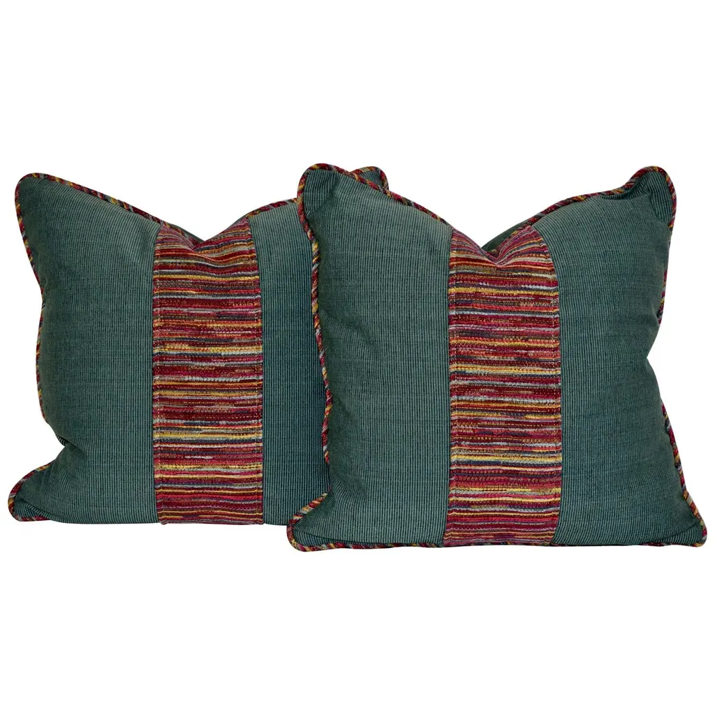 Handmade pillows with a teal faille border surrounding a central square of multicolored woven fabric. The back panels are made from the woven fabric, as well as the welt around the pillows. The pillow covers have hidden zippers and the feather inserts are removable. Dry clean only.