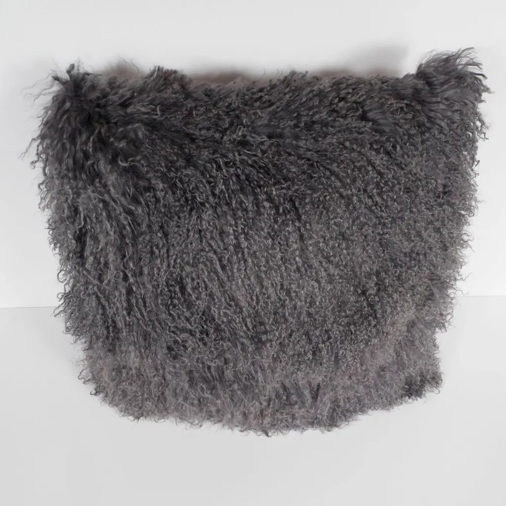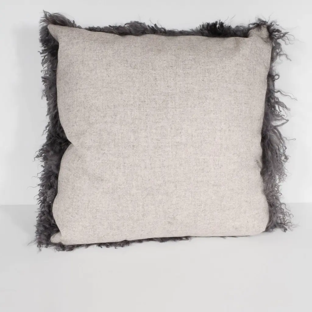 This exquisite custom pillow was handmade using the softest virgin Mongolian lamb in the world. It has been dyed in a rich slate gray hue. The back of the pillow has been woven in a subtly textured heather gray composed of a luxurious wool and cashmere blend. This exceptionally crafted and stunning pillow would be a winning addition to any sofa or daybed, and would fit seamlessly with practically any style of interior from Classic to ultra modern. It is brand new and in mint condition. We have several identical pillows available for immediate delivery.American, 21st centuryDimensions:20" D X 20" W X 8" H.