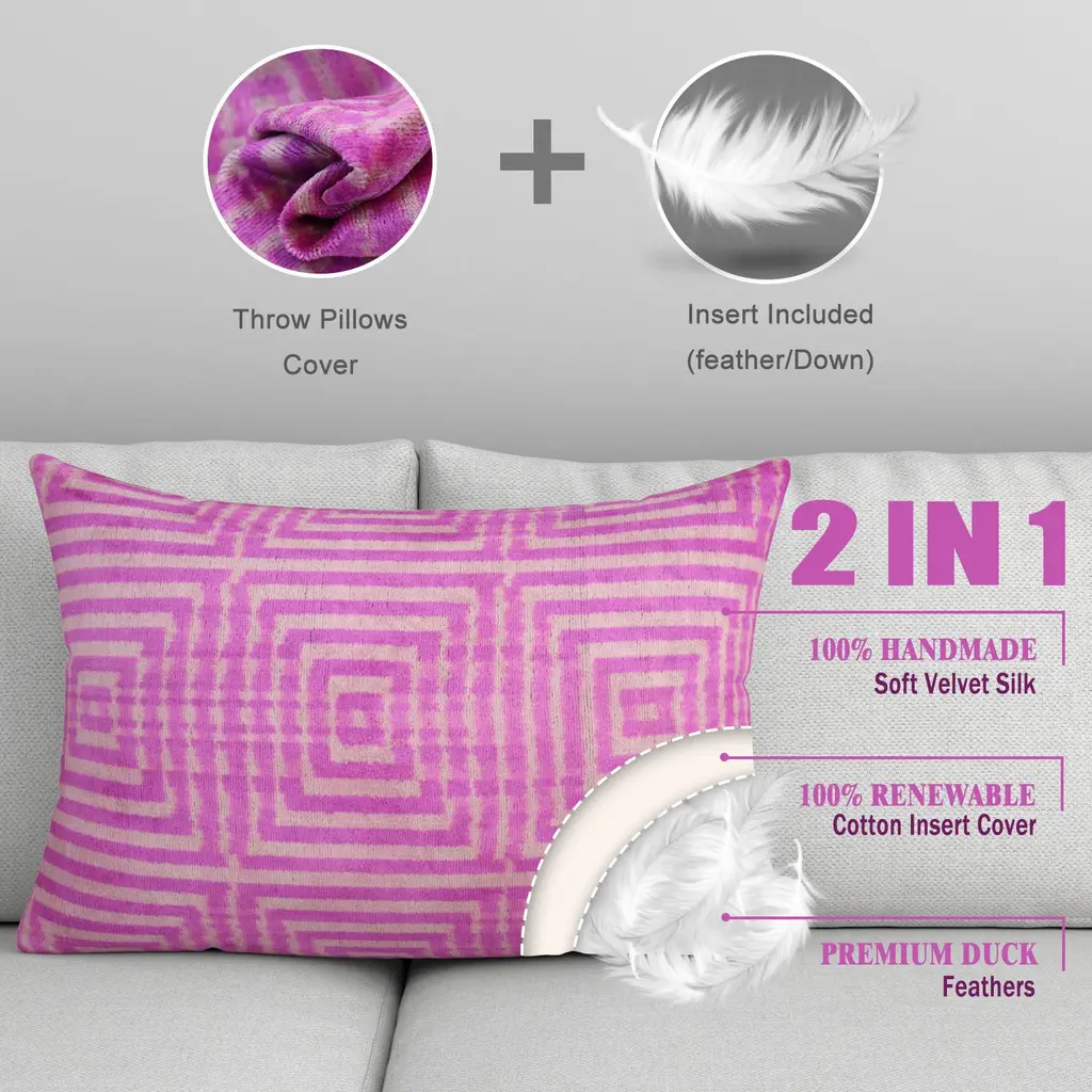 stunningly gorgeous thick velvet material making the throw pillows super soft, and cozy, and with a delicate touch and giving your room a more elegant look. Ikat design gives these throw pillows a more artistic, a sort of a traditional look. Matching with throw pillows of different colors suitable with the color tone these velvet throw pillows will make your living room more lively and bright. PREMIUM DOWN FEATHER INSERT INCLUDED (The duck feather filling feels fluffy and gives your body excellent