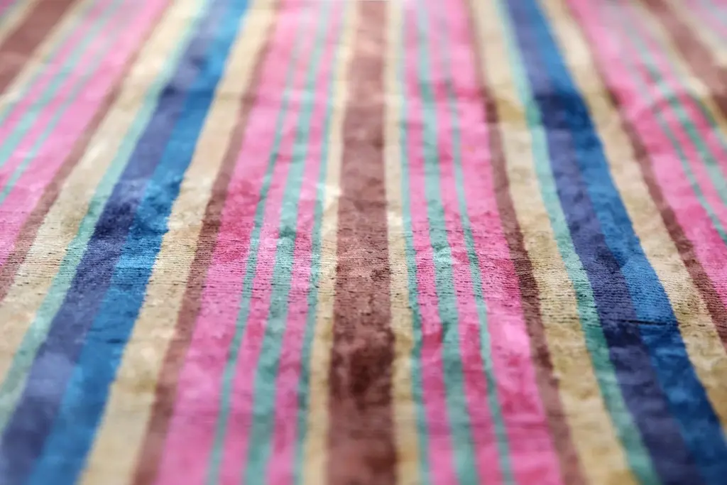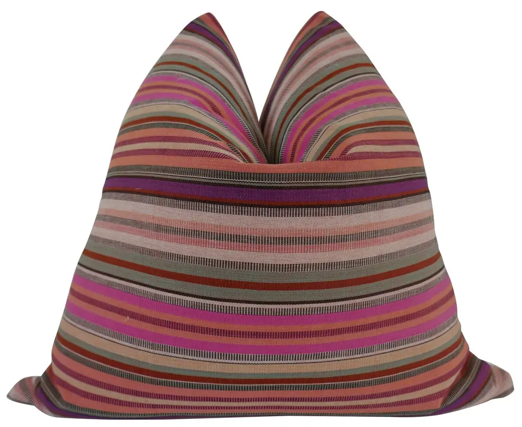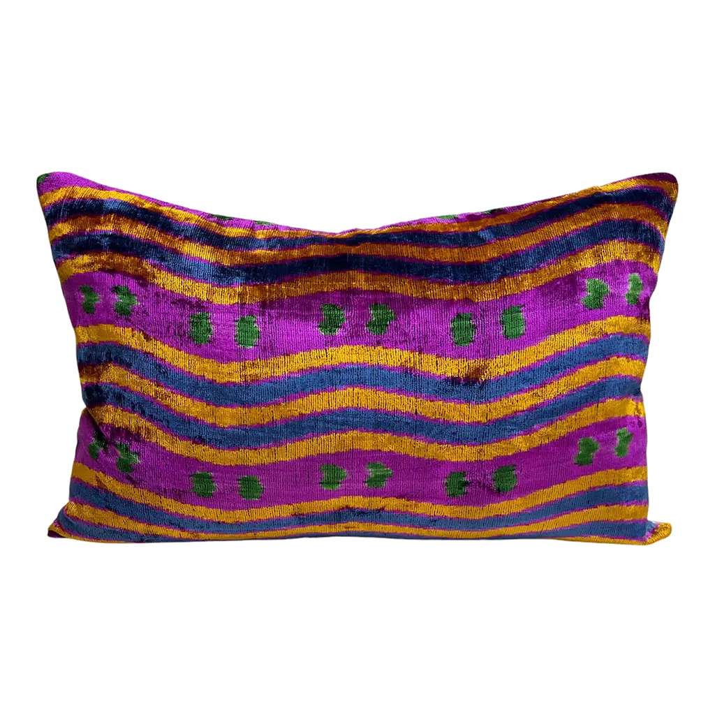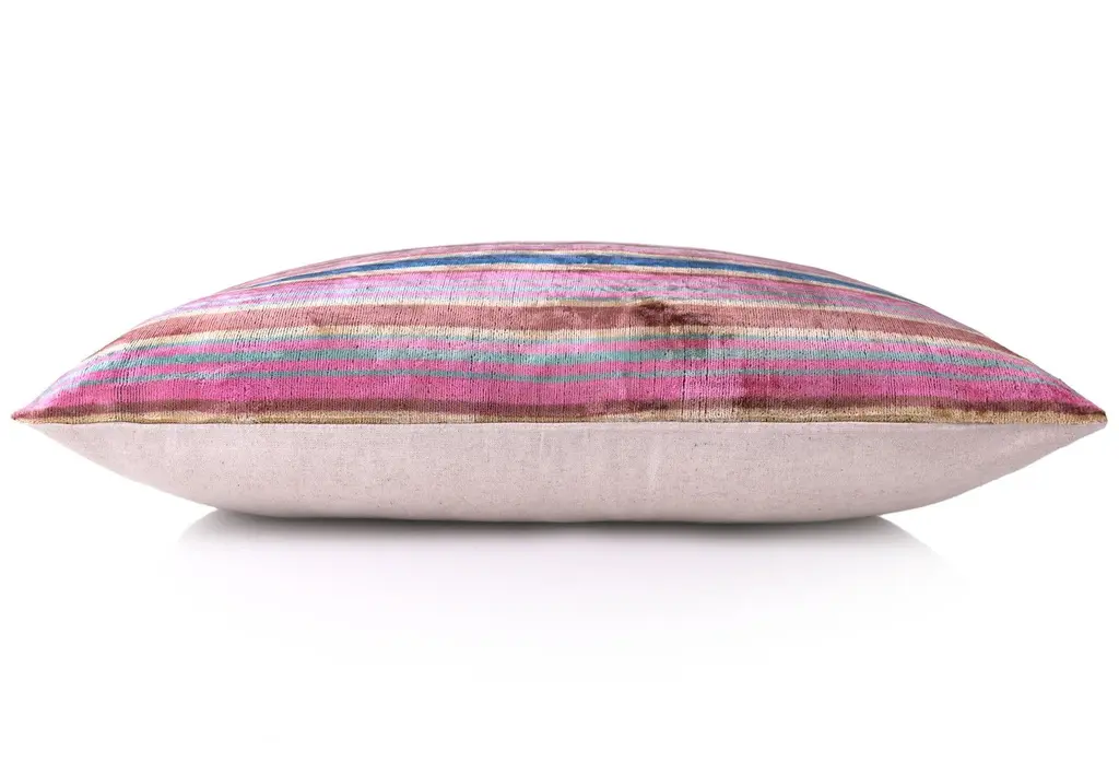 "Made from hand-loomed silk velvet sourced from Turkey & Uzbekistan Bold multicolor striped pattern in pink, navy, teal, and earth tones Artisan-crafted in our California atelier with a cotton canvas backing Filled with premium feather-down insert for luxurious comfort Vegetable-dyed for a non-toxic, eco-friendly, and rich finish Unique one-sided design; slight variations add handcrafted charm Perfect for bohemian, modern eclectic, or global-inspired interiors Infuse your space with energy and artisan elegance using our Handmade Striped Velvet Pillow, designed to stand out in both vibrant and neutral palettes. Sized at 16x24 inches (40x60 cm), this silk velvet cushion is woven by skilled artisans in Turkey and Uzbekistan, then carefully sewn in our California workshop by master tailors who take pride in every detail. The multicolor stripe pattern—featuring soft pinks, ocean blues, deep browns, and forest greens—is inspired by vintage Ikat traditions and reimagined for modern interiors. Its soft sheen and subtle color shift under light reveal the depth and craftsmanship that set this pillow apart from mass-produced alternatives. Whether layered with solids or other patterns, this piece makes a confident and luxurious statement in any setting. Suggested Use (For Interior Designers) Pairs beautifully with walnut or rattan furniture and colorful art Ideal for layering with neutral cushions in bold interior projects Works well in boho-chic, maximalist, mid-century, and global homes Great for boutique hotel lounges, reading nooks, or creative studios"