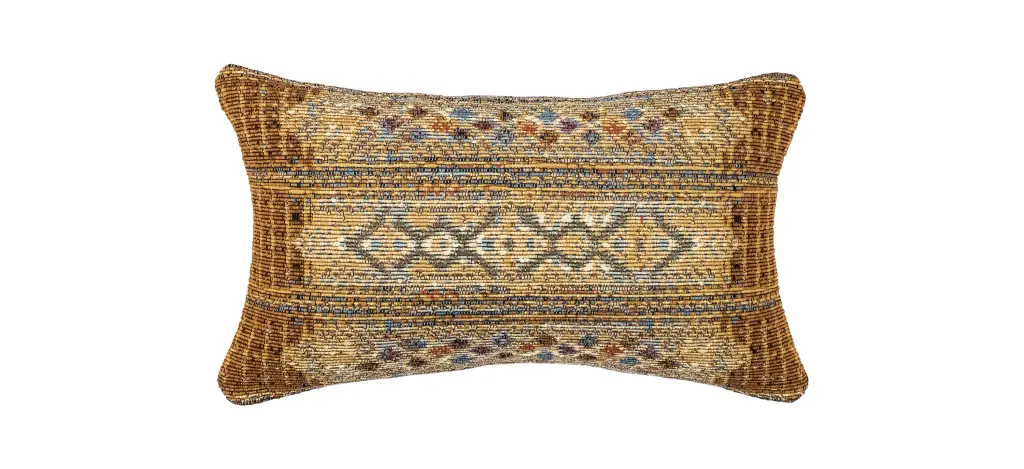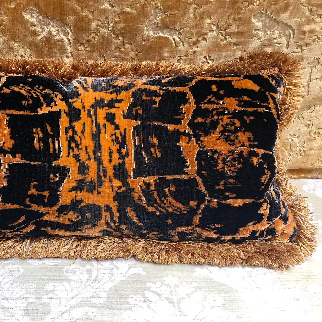 The cover of this cushion is part of the Handmade Collection and is masterfully created on eighteenth-century looms. The piece boasts a geometrical motif reminiscent of a turtle shell in bold black and gold colors, finished with a soft marabou fringe around the edges and a zipper closure. The cushion will add a striking accent to a modern home.