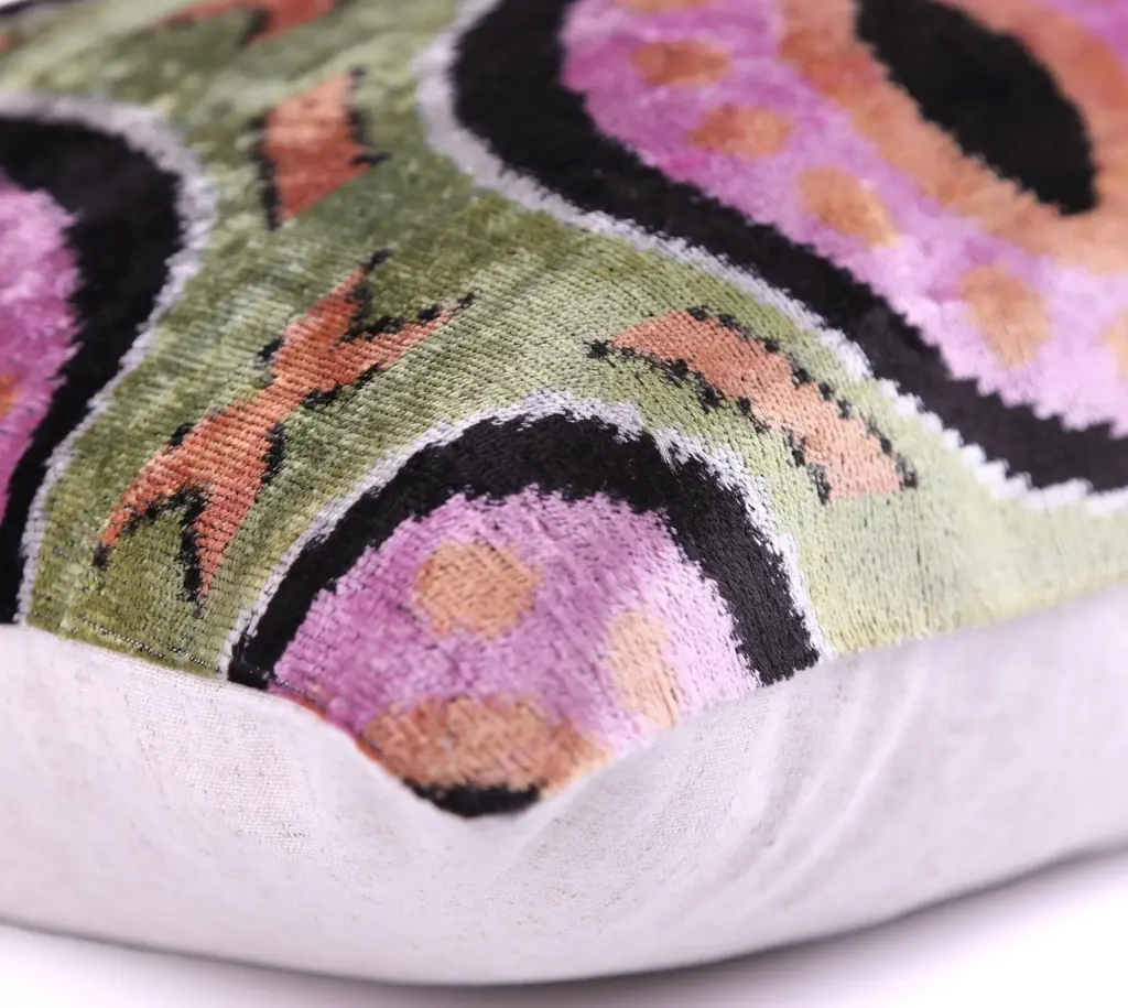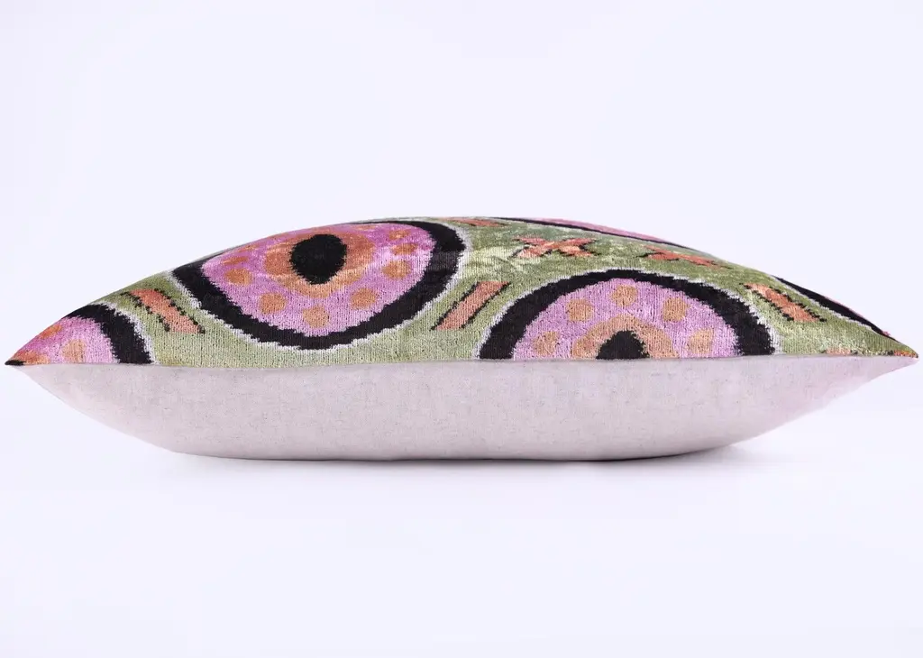 "Artisan-crafted in California using traditional techniques Silk velvet from Turkey & Uzbekistan – richly textured and soft Naturally dyed in sage green, lilac, peach, and black tones Bold circular pattern inspired by traditional ikat artistry Includes a premium feather insert – plush, supportive, luxurious Neutral cotton back with hidden zipper closure Size: 16x24 inch (40x60 cm) – ideal for beds, sofas, or chairs Best for: Boho, maximalist, eclectic, or color-forward interiors Pairs beautifully with blush, black, lavender, olive, ivory, or gold Great with velvet, raw cotton, rattan, or walnut furniture finishes Capture attention and soften your space with this exquisite handmade velvet pillow, featuring a hypnotic circle motif in lilac, peach, black, and sage green. Crafted using centuries-old ikat techniques, this piece blends time-honored artistry with vibrant modern styling. The silk velvet is handwoven by artisans in Turkey and Uzbekistan, then dyed with natural vegetable-based pigments for a finish that’s both rich in tone and gentle on the environment. The light-reflective velvet reveals tonal shifts and softness from every angle—bringing texture and depth to any interior. Each pillow is cut and sewn in our California atelier, where expert tailors ensure perfect alignment and top-tier finishing. A hidden zipper and soft cotton backing complete the refined look, while a premium feather insert provides both structure and plush comfort. Whether styled in a colorful boho room, a maximalist corner, or layered into an eclectic designer arrangement, this pillow offers a confident, artful accent."
