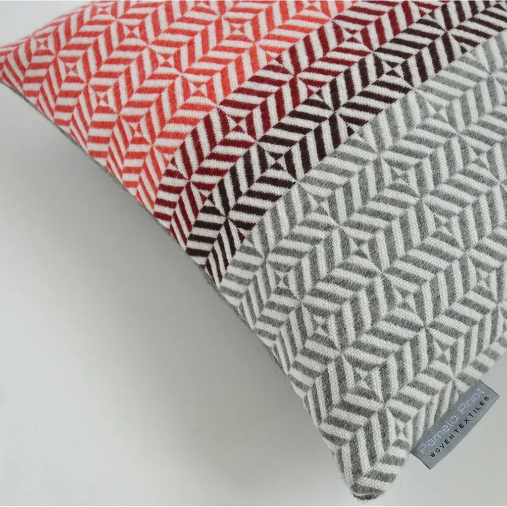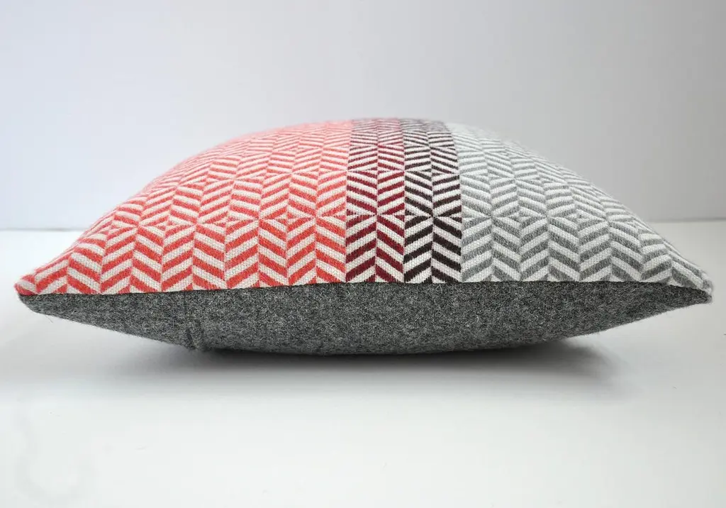 Drawing inspiration from the color and pattern found in stain glass work, the Uccle cushion takes its name from an area of Brussels renowned for its Art Deco architecture.Handwoven on a dobby loom in our studio using soft merino lambswool and a traditional extra weft weaving technique, each cushion is meticulously made by hand.The cushion is backed with handwoven Harris Tweed and comes with an optional cushion insert filled with British fleece, making this a completely sustainable product.Two pieces available. Further pieces can be made to order. Also available in Indigo, Grey/Indigo, Piccalilli Yellow and Pearl Grey. A bespoke option is available in colours / size of the client's choice.Please note orders outside of the UK will be sent without the British Fleece insert. The shipping cost on the listing for orders outside of the UK is for the cushion cover only. If you would like to purchase the cushion with the insert you will need to request a shipping quotation..Front: Handwoven British-sourced Merino LambswoolBack: Handwoven Harris Tweed in Mid Grey or Burgundy with zipOptional Cushion Insert: 100% cotton cambric cover with zip filled with British Dorset Horn fleeceCare: Dryclean or handwash gently in cool water with a detergent designed for delicate materials. Reshape whilst wet and dry flat.
