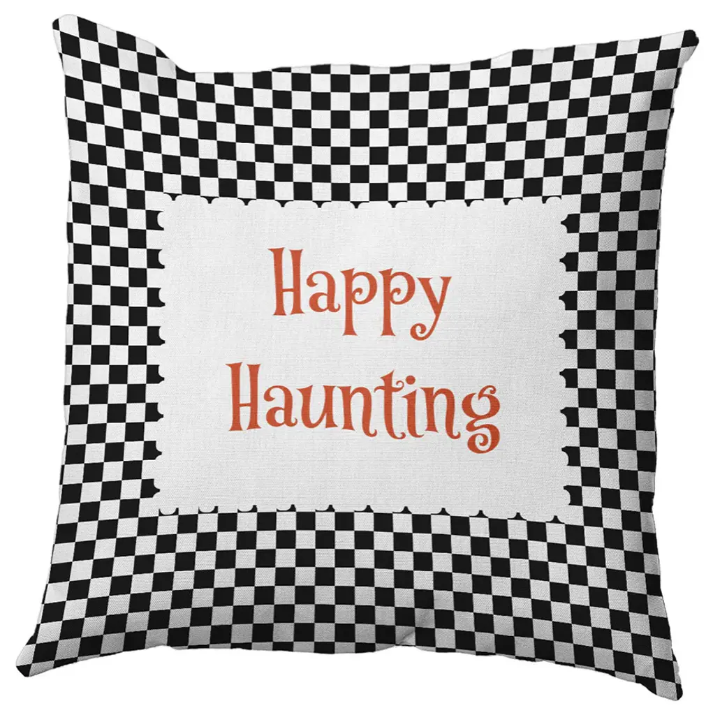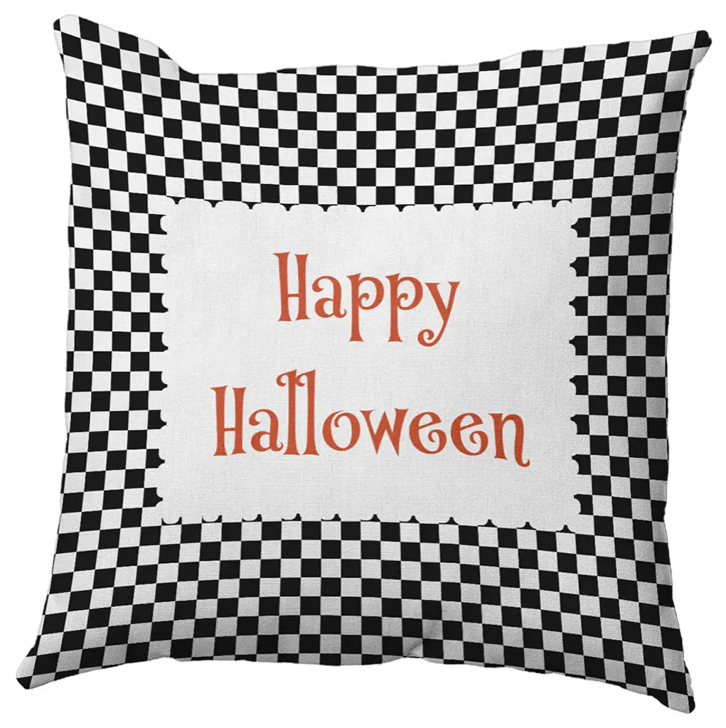 Create a festive and fun atmosphere in your home this Halloween season with our Halloween Happy Halloween Checks Pillow from the Witches Brew Collection. This indoor/outdoor pillow will add fun and style to your porch, deck or patio! This decorative pillow is printed on both sides and crafted with a soft, durable polyester exterior, and filled with down alternative for a crisp look and a comfortable sitting experience. The fabric is resistant to weather, mold, and mildew so you can accentuate your indoor or outdoor decor. It is sewn closed with a knife edge and can be easily spot cleaned or dry cleaned. The quirky designs in this collection are the perfect way to enhance your fall decor and to bring a smile to all who encounter them.