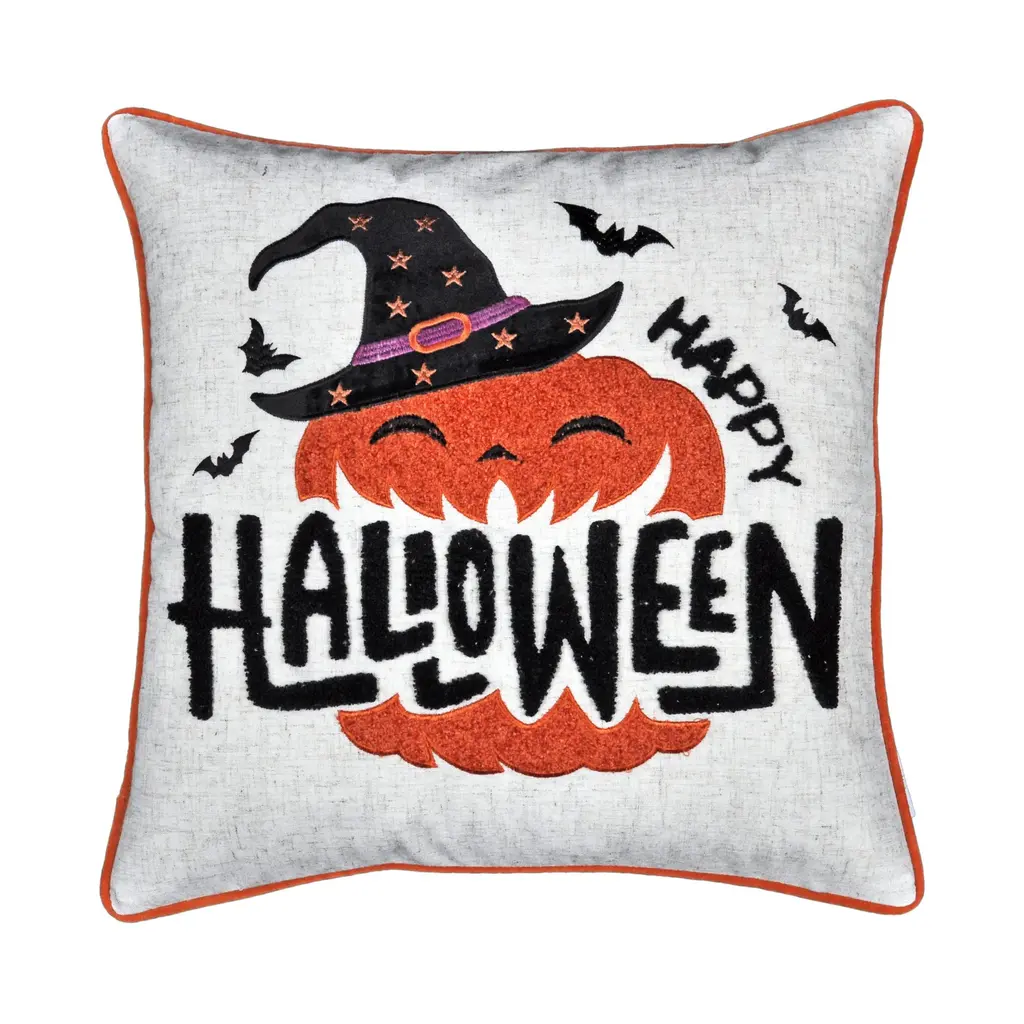 Playful pumpkin and witch hat embroidery with “Happy Halloween” text. Bold Halloween-themed design with bats on a neutral background. 20x20 inch square size, perfect for couches or beds. Includes soft polyester-filled insert for immediate use. Great for Halloween decorating, parties, or seasonal ambiance