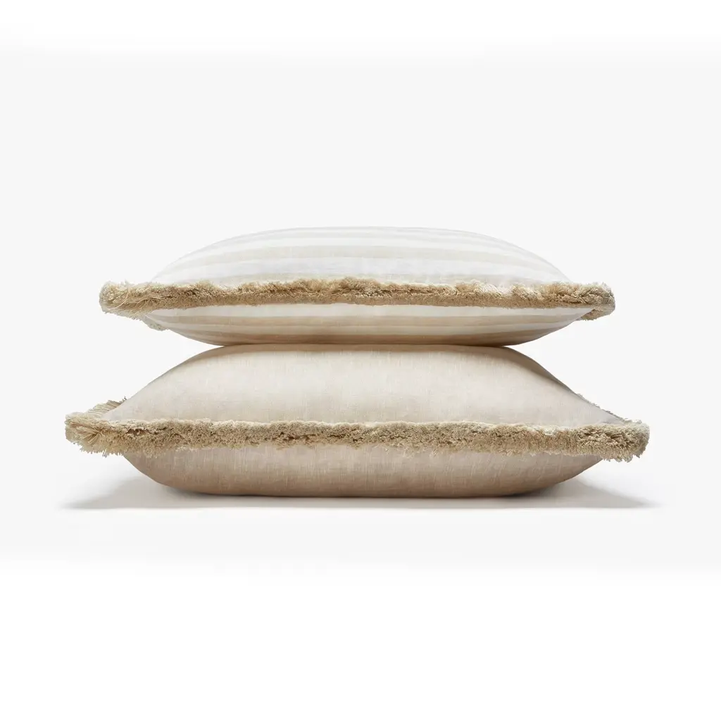 Happy Linen Pillow Striped White Beige With Beige Fringes