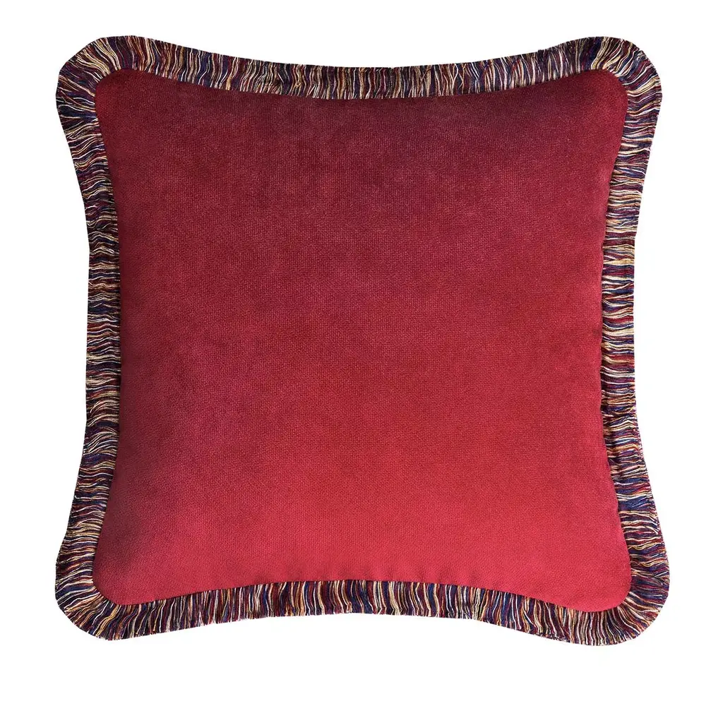 The chromatic scheme characterizing this cushion lends it a distinct luxe yet restrained allure. It features soft padding in polyester fiber, while its square silhouette is outlined by bold garnet cotton trimming outlining the velvet upholstery. The possibility to easily remove the cover simplifies its cleaning process.Colour: brick red cushion with brick red, light blue and beige trimmingSize cm 50x50 Customizable for size and colours