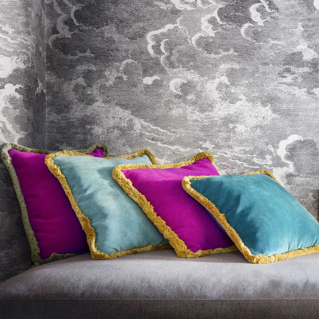 Ecletic soft velvet cushion with cotton fringes. This cushion is a textile masterpiece for beds and sofas. This insert cushion is crafted with velvet fabrics and cotton fringes, adding a touch of sartorial elegance to a living space. Each cushion bearing the Lo Decor signature embodies the passion and skill of Italian artisans. With its impeccably inserted zipper closure and hypoallergenic padding, each cushion offers not only unparalleled aesthetics but also maximum comfort and well-being.