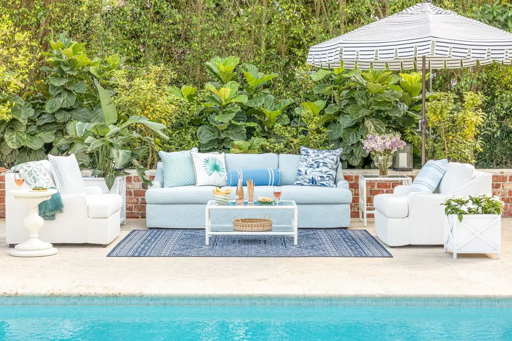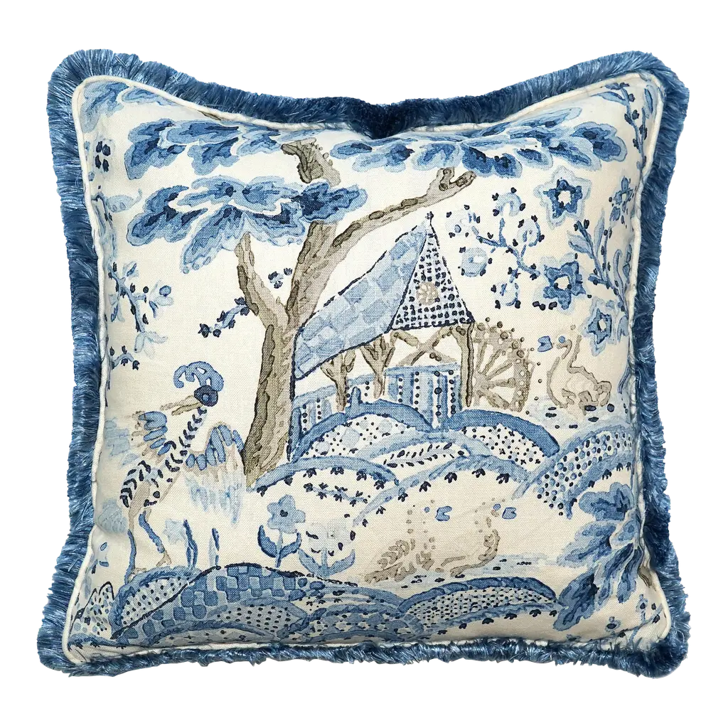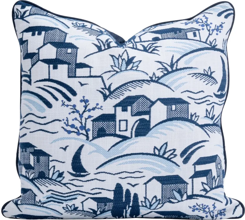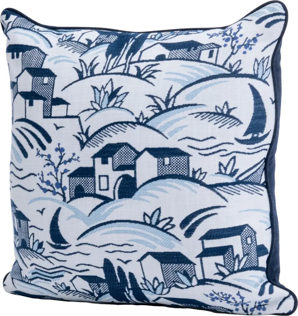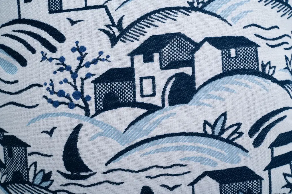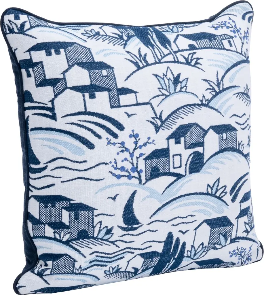 Designed by us and available only here: Made in the USA and boasting a contemporary take on traditional toile motifs, this pillow will bring timeless finesse to your porch, patio, or sunroom. The UV-resistant, water-resistant fabric ensures that it will retain its good looks for seasons to come. Solid back.
