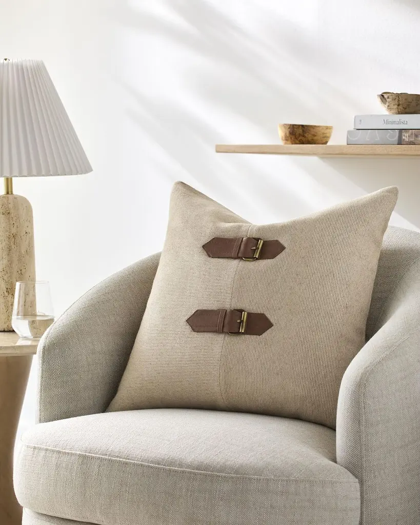 Designed by Galey Alix, the Harkin accent pillow combines classic elements in a fresh way. Crafted in India from a luxurious blend of linen, viscose, and cotton, the contrasting textures and vegan leather buckle details will brighten up any living space.