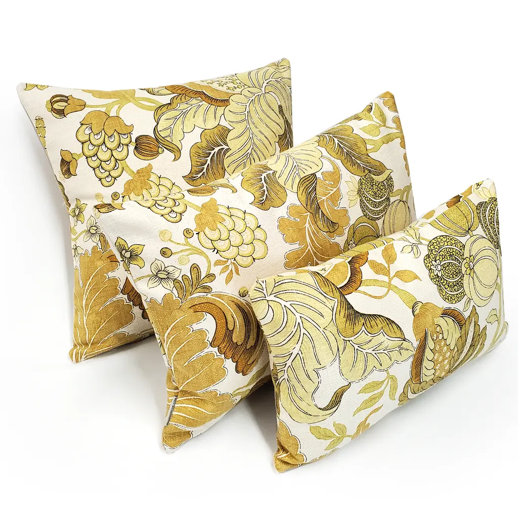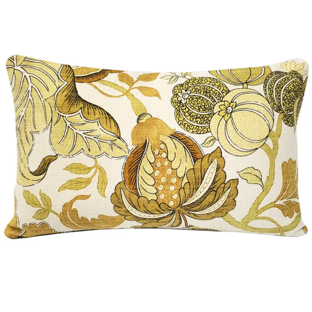 You will adore this romantic and colorful floral print pattern. The Harvest Floral Yellow Throw Pillow features blooming flowers, leaves and seeds, that sweep across the front and back in soft shades of ochre, mustard and buttercup yellow. The background of the pillow is cream. The fabric is a soft yet sturdy broad weave, made from a high quality cotton, linen, polyester blend. The colors have a wonderful natural faded appearance, and just gazing at it sets your mind at ease. This gorgeous pillow is available in three sizes and partners up beautifully with solids and soft stripes. Size: 16"x24" Rectangular Fabric: 71% Cotton / 19% Polyester / 10% Linen Same fabric front and back Knife edge seems Color matched, hidden zipper closure Dry clean only Made in Canada: Designed and made in Pillow Decor's Vancouver workroom.
