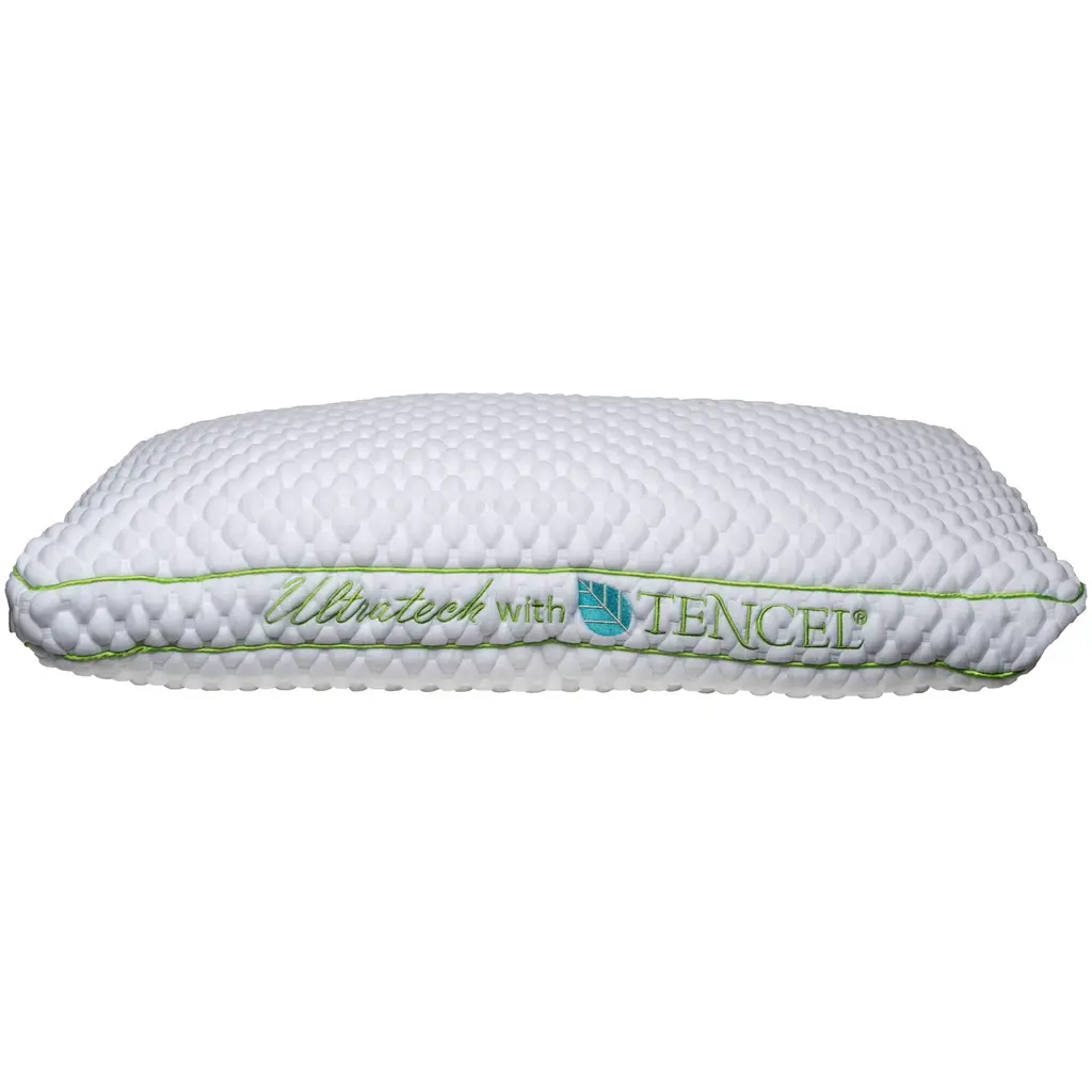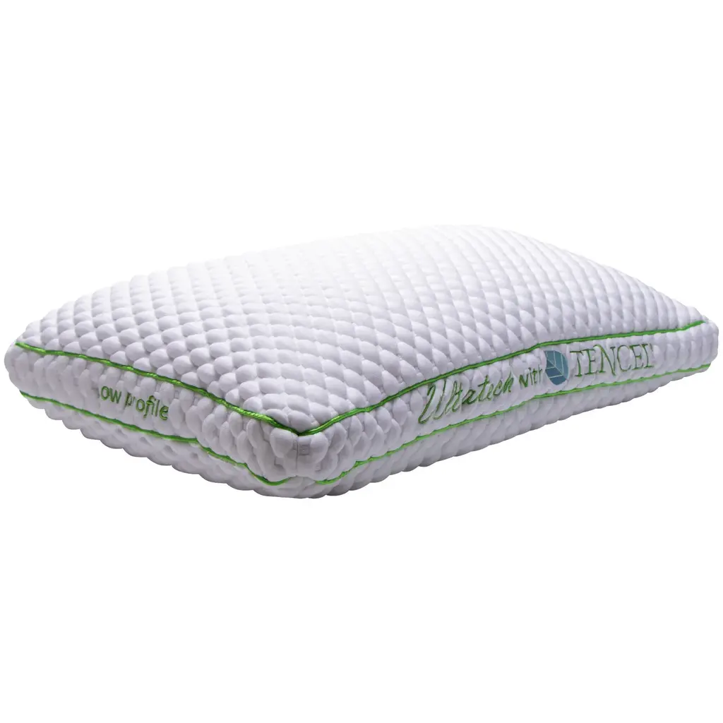 Enjoy a great night's sleep with the Ultra-Tech low profile pillow. Designed for stomach sleepers, the low profile of this pillow aligns the head, neck, and spine for your personal sleep style. The center is filled with microfiber polyester to keep its shape, while the cover is Tencel with air pockets to regulate temperature and wick away moisture, keeping you cool and comfortable. Machine washable.