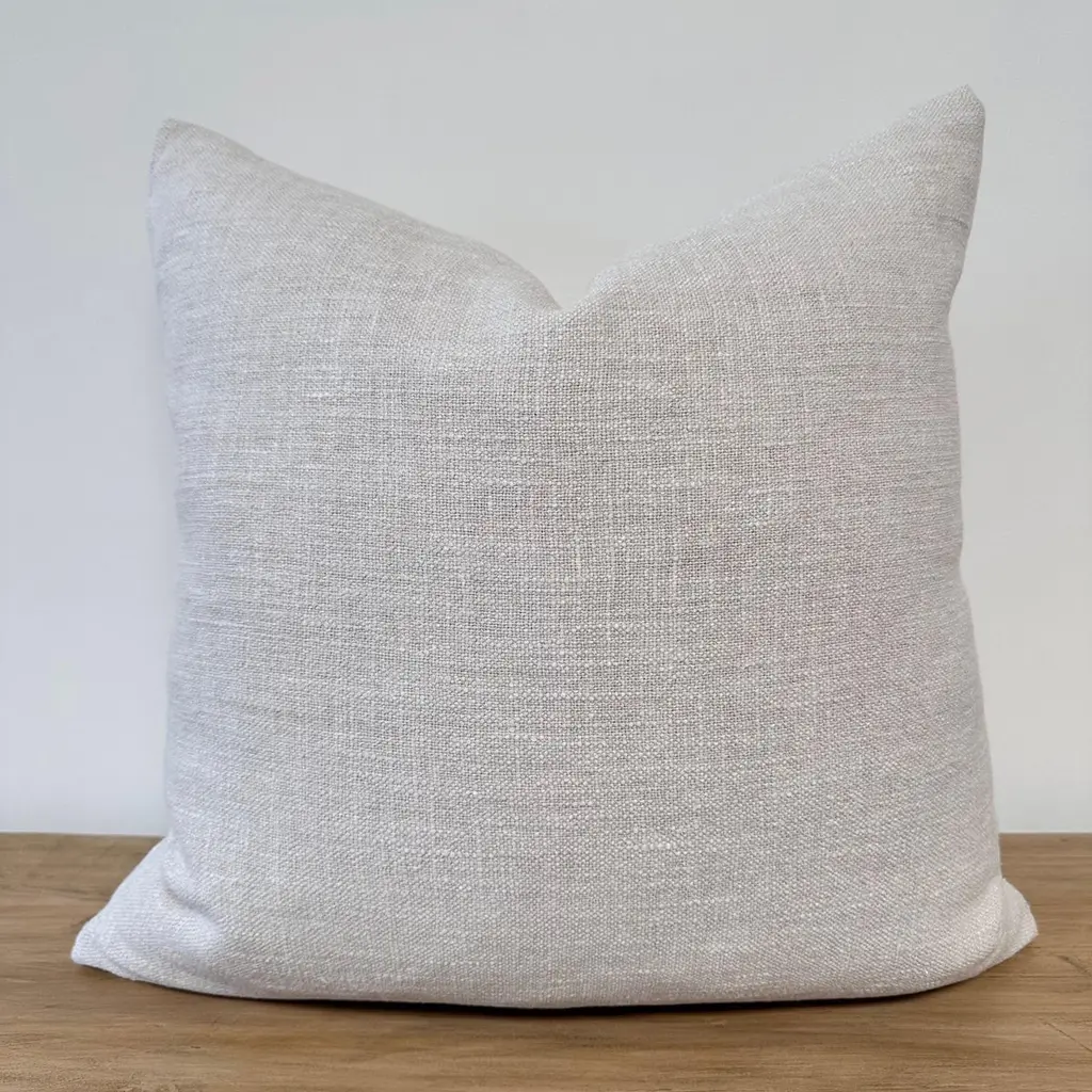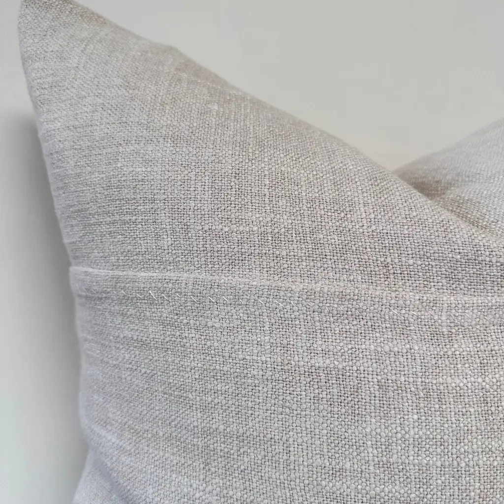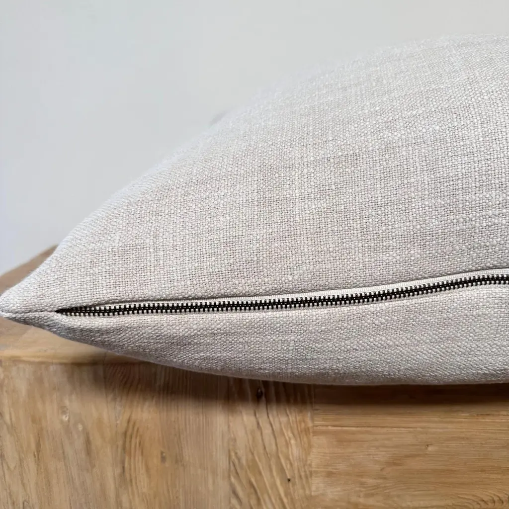 Collection the Alora Stonewashed Linen Constructed of a heavy woven linen, at 40.3 oz per yard.Sewn with a hand-stitch detail, made with 100% wool. Due to the unique hand stitch yarns, the pattern varies which are normal and to be expected. Each pillow is unique and one of a kind.Pigment dyed, sewn with an antique brass zipper, and overlocked edge. Possibly our most coveted linen collection ever!Size: 22x22 / includes a down feather insert.Color: OatmealCustom sizes availableIncludes a down feather insert.Care: Dry cleaning recommended.