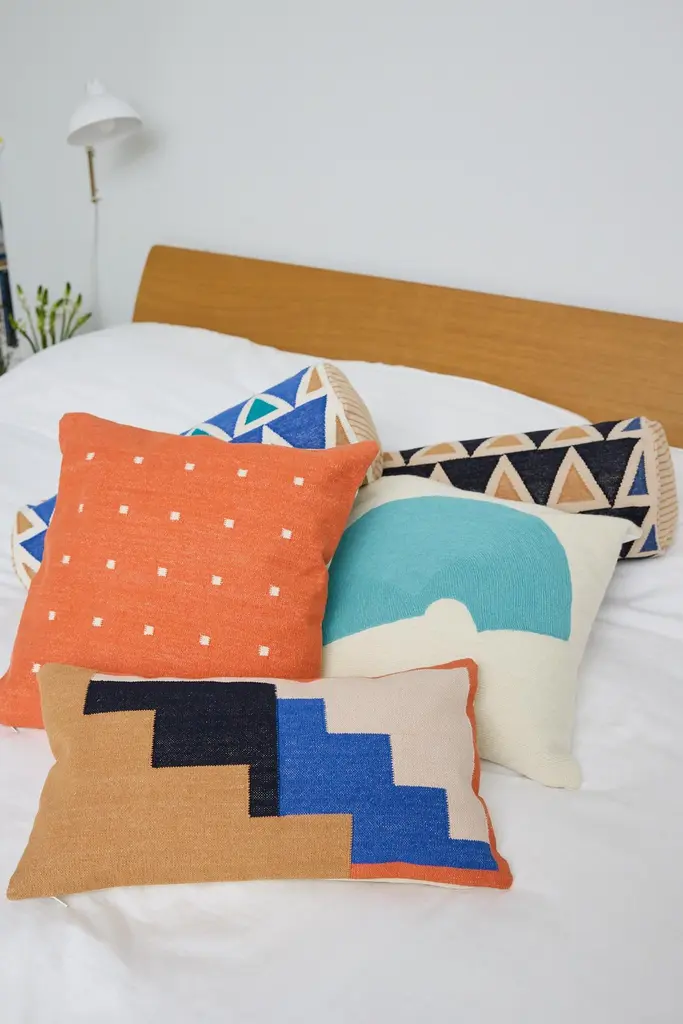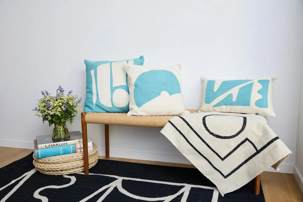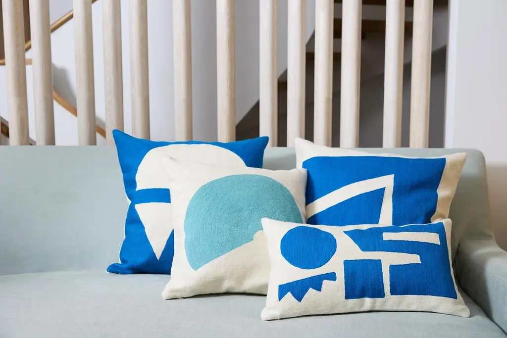 These geometric throw pillows have been ethically hand embroidered by artisans in Kashmir, India, using a traditional embroidery technique which is native to this region.The purchase of this handcrafted pillow helps to support the artisans and preserve their craft.Each piece may vary slightly due to the nature of handcrafted goods.Face: wool embroideryReverse: cottonConcealed zipper closure Measures: 18" x 18"Dry cleanInsert not included.