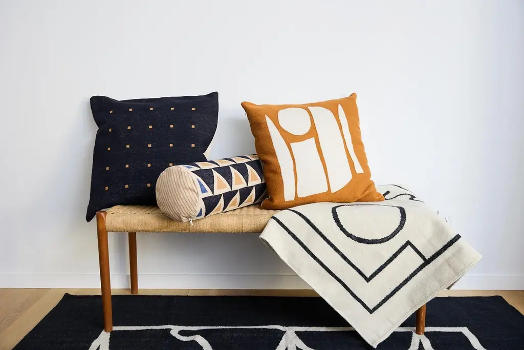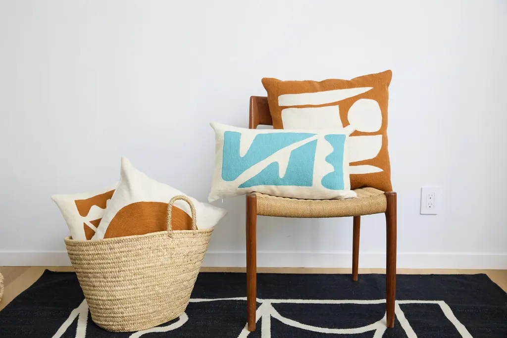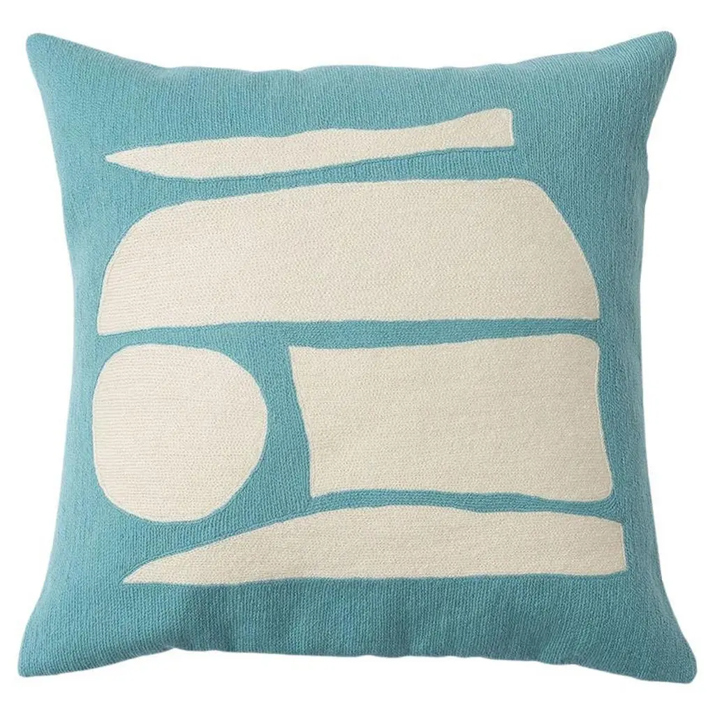 These geometric throw pillows have been ethically hand embroidered by artisans in Kashmir, India, using a traditional embroidery technique which is native to this region.The purchase of this handcrafted pillow helps to support the artisans and preserve their craft.Each piece may vary slightly due to the nature of handcrafted goods.Face: wool embroideryReverse: cottonConcealed zipper closure Measures: 20" x 20"Dry cleanInsert not included.