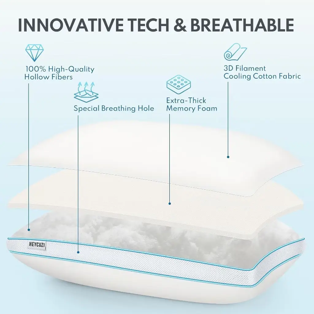 Heycuzi Pillow Queen Size Set Of 1 For Sleeping, Fluffy Down Alternative Microfiber And Memory Foam Fill,breathable Hotel Pillows (Low)