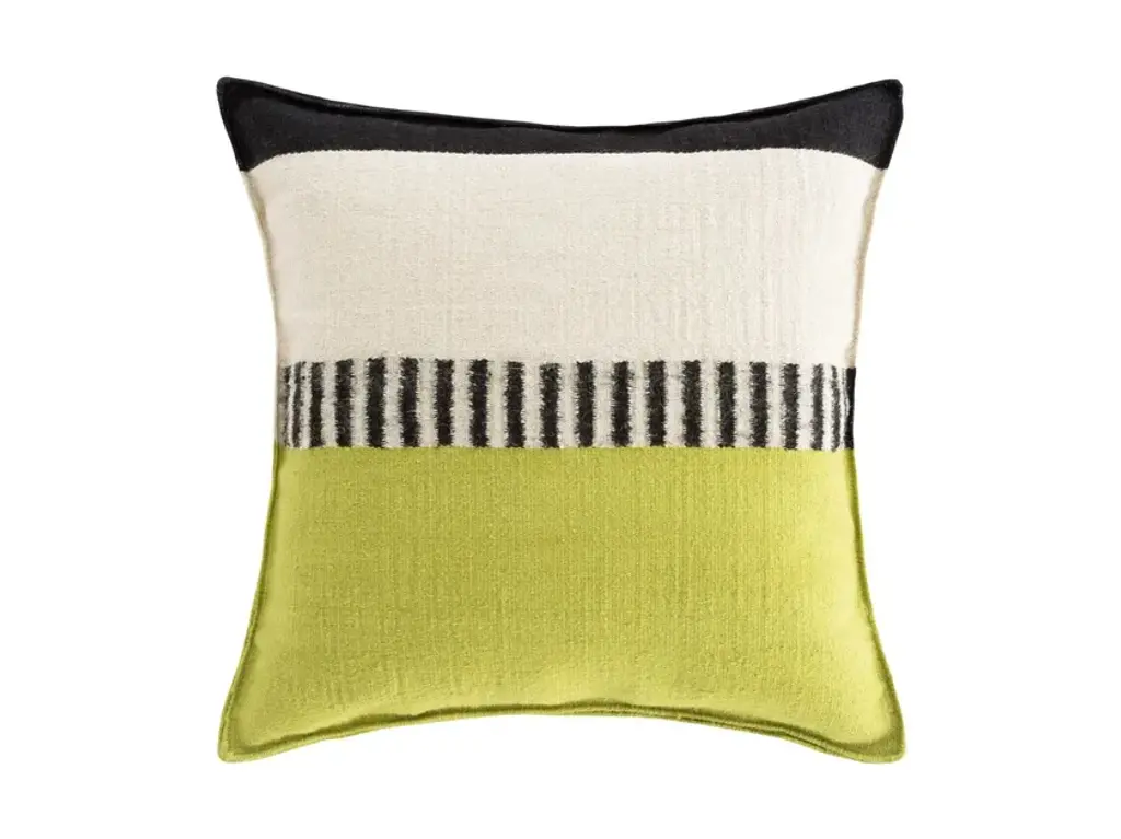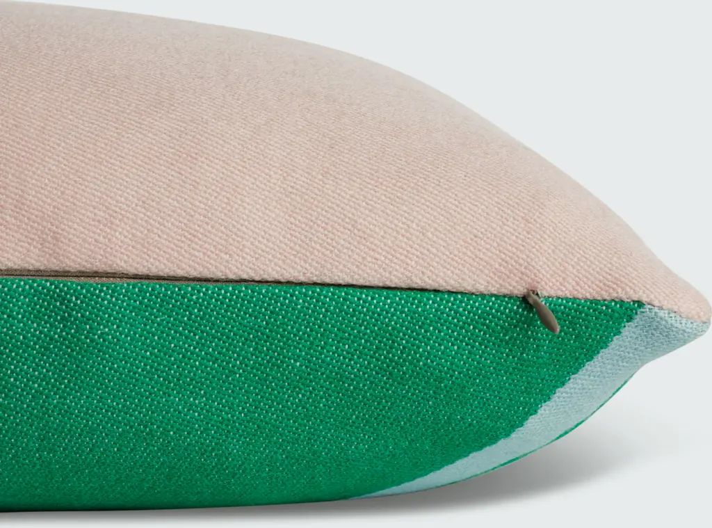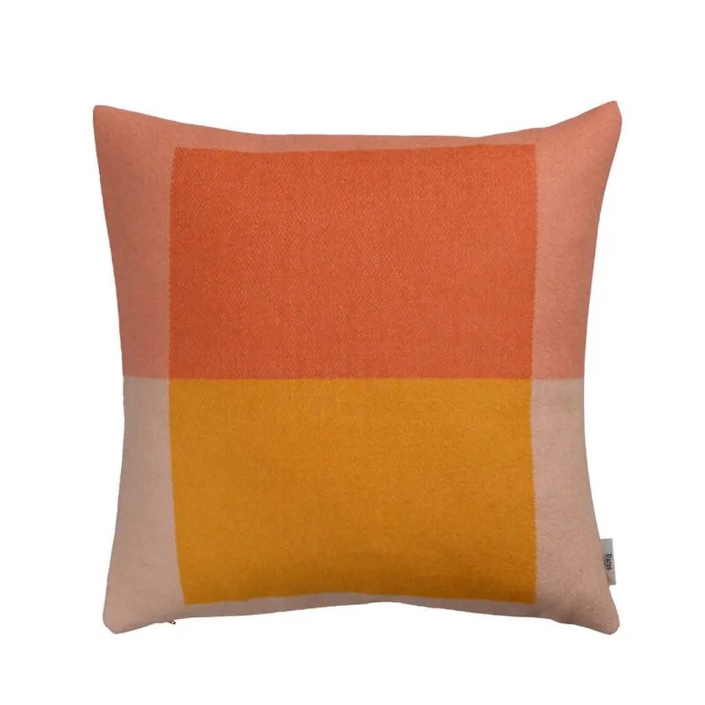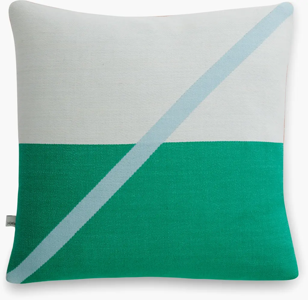 An eye-catching, cozy addition to any sofa, chair, or bed, the Hjelle Glimt Pillow (2021) is woven from fine wool. Created in collaboration with Copenhagen-based designers Nan Na Hvass and Sofie Hannibal, this modern geometric pattern was inspired by the exotic landscapes they experienced as children. Made in Norway.