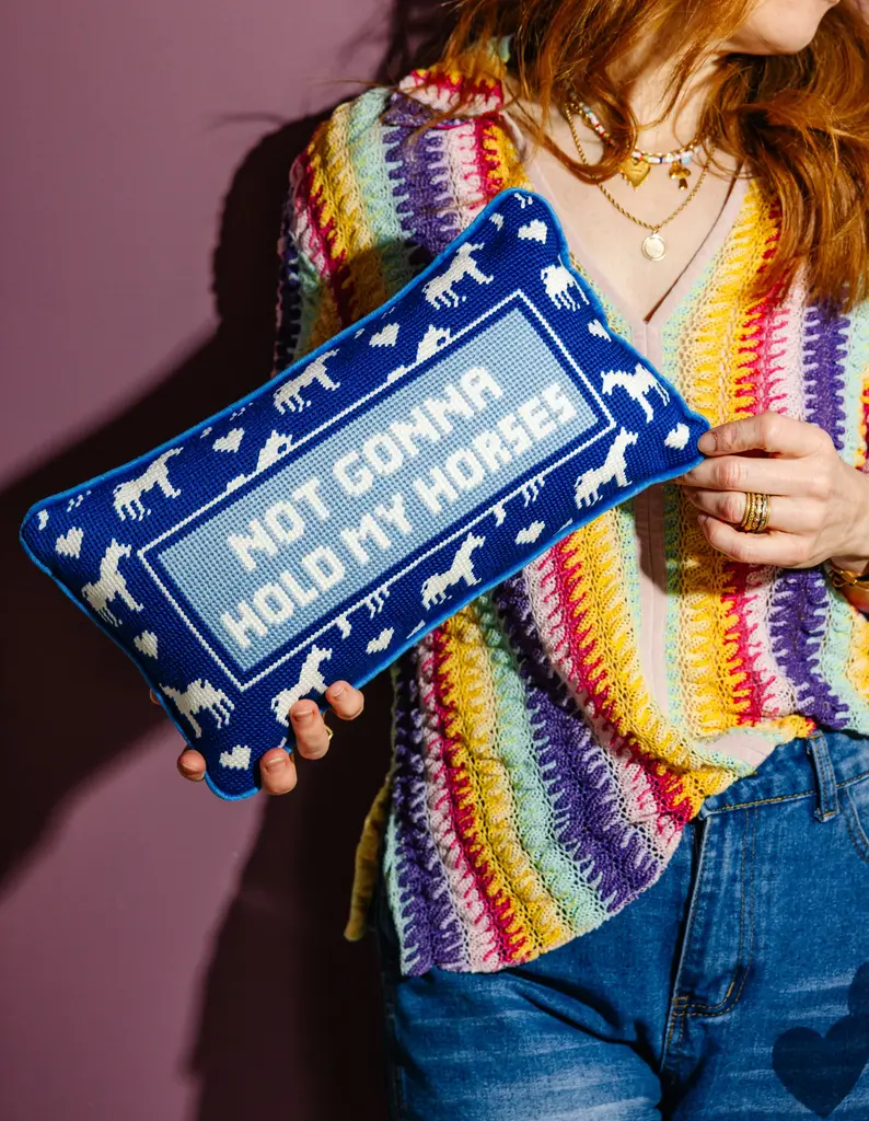 For the ones who know that patience isn't always their strong suit. This pillow is for those who say, ‘Not gonna hold my horses,’ because when you're ready to go, you’re ready to go—no waiting around. Embroidered and backed in luxe velvet, we've revived a Southern craft with charming sayings that are sure to get a smile. With over 100 styles to choose from, they are sure to spark joy, plus they make the perfect gift! Check out the full collection here. Measures 8" x 14" - Small pillow, big statement!