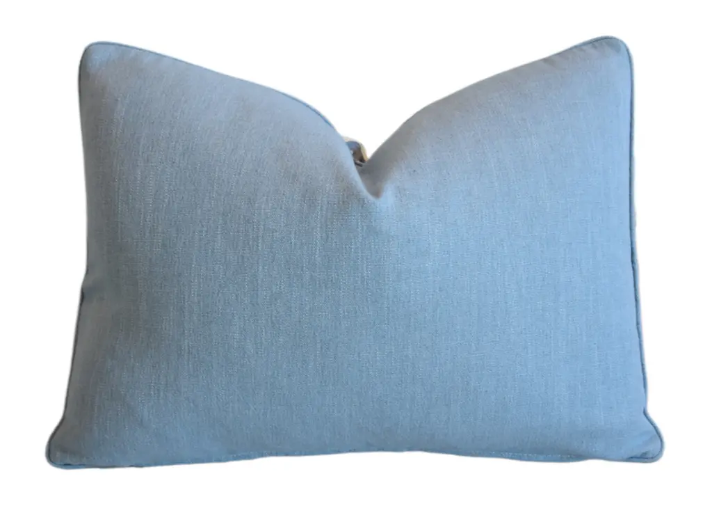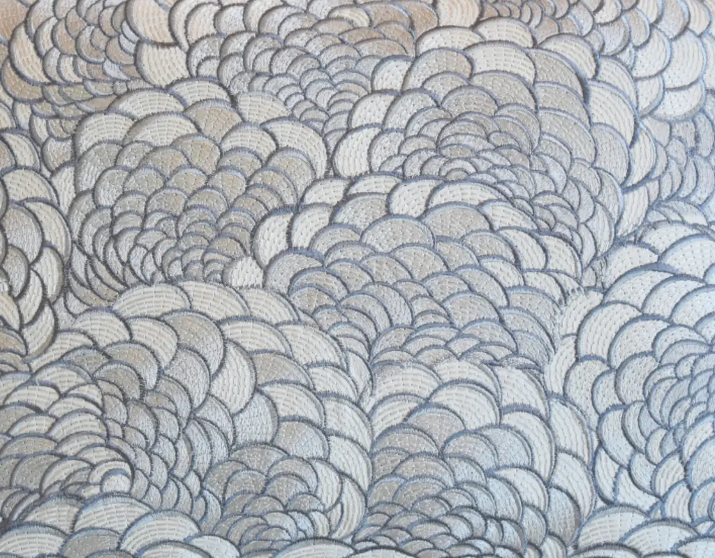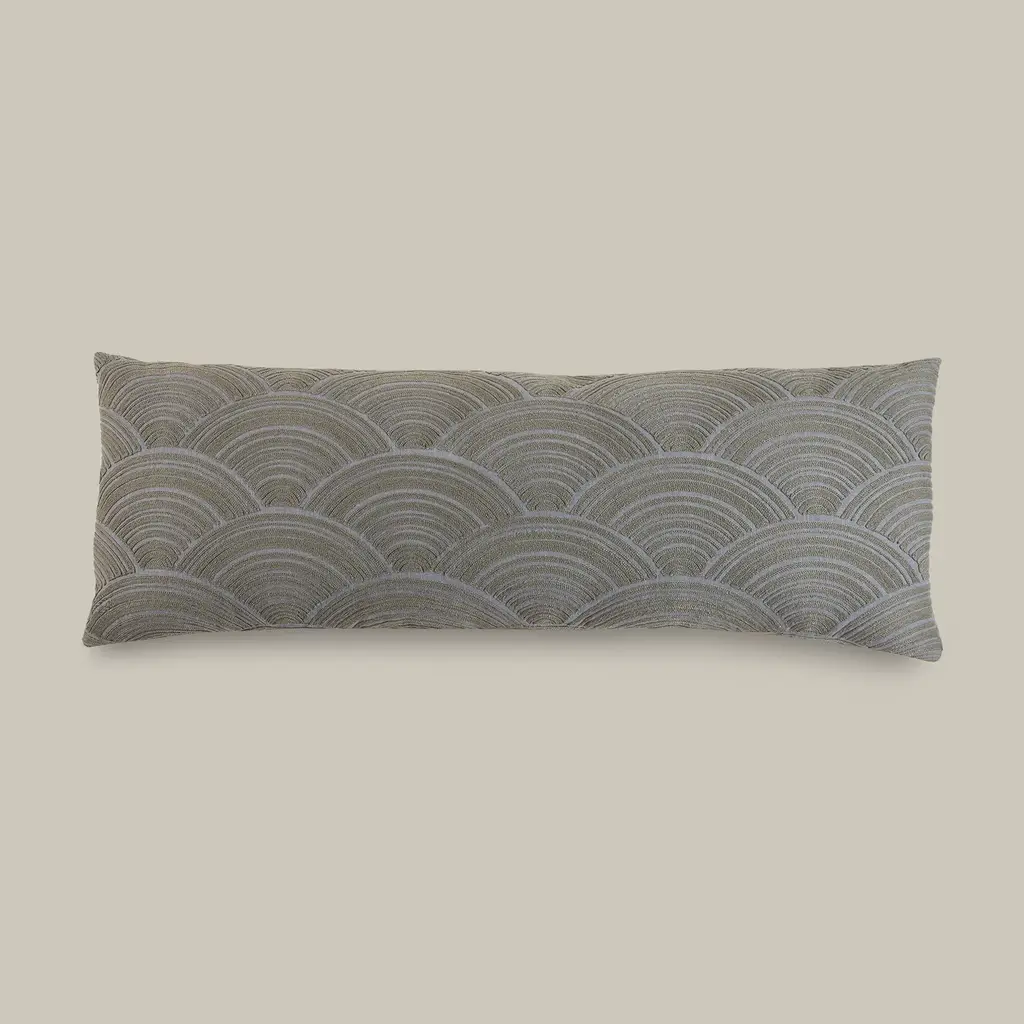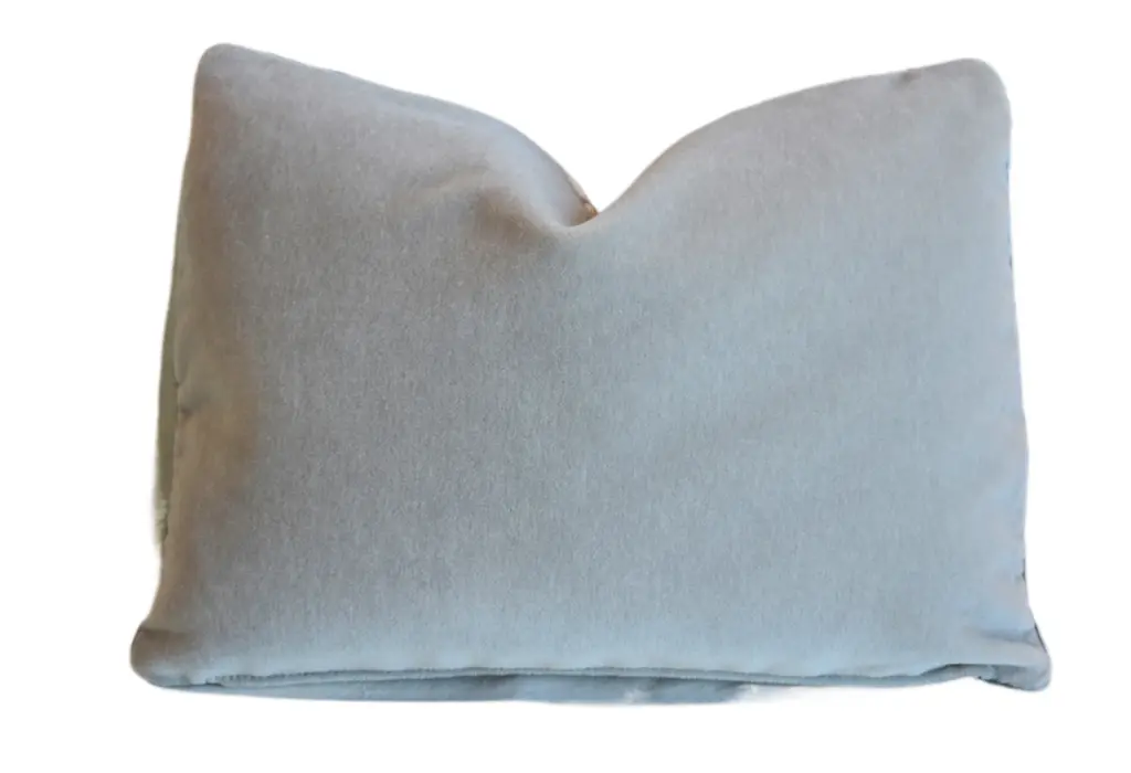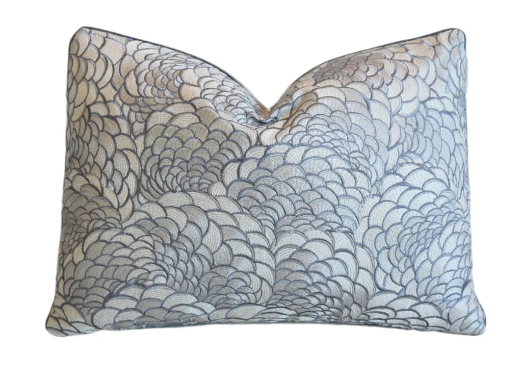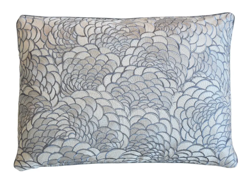 A custom-tailored designer pillow by Mike Seratt of The Prized Pig in designer Holly Hunt's embroidered fabric, "Sensu Iced," depicts a beautiful, modern, contemporary pattern. It has a Complimentary Wool-velvet fabric back, custom-tailored cord trim, a zipper closure, and a plump goose down-and-feather insert. It is in excellent new, unused, perfect condition!