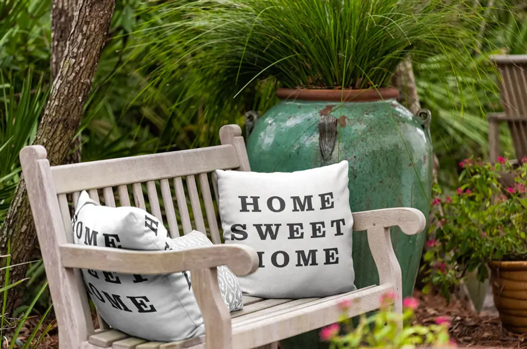 Create a fun and personal vibe with a Home Sweet Home Pillow from our ''A Way With Words'' Collection. This indoor/outdoor pillow will add the personalized touch to your porch, deck, or patio that you''ve been looking for! This decorative pillow is printed on both sides and crafted with a soft, durable polyester exterior, and filled with down alternative for a crisp look and a comfortable sitting experience. The fabric is resistant to weather, mold, and mildew so you can accentuate your indoor or outdoor decor. It is sewn closed with a knife edge and can be easily spot cleaned or dry cleaned. It has never been so easy to enliven your home with fun and inspirational messages for your daily life.
