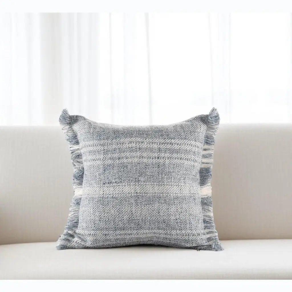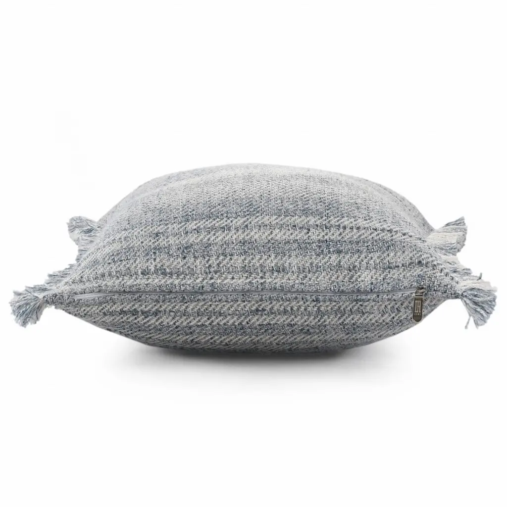 Bring a bit of fashion and zip to your space with this eye-catching and comfy 20-inch denim blue and ivory fabric striped throw pillow. This denim blue and ivory hued piece represents quality construction, expertly made from durable polyester that is not only long lasting but soft to the touch as well. Super soft and built to hold its shape, this polyfill-filled pillow is a great option. For anyone that loves to decorate or accent their space with color and texture. A great decorative accessory to add color and dimension to your favorite chair, accent your sofa, or to use as part of your bed ensemble. 20-inch h x 20-inch w x 4-inch d.