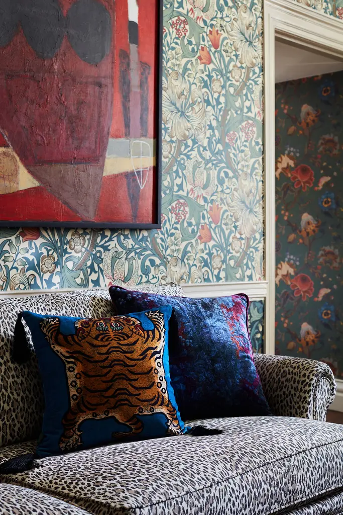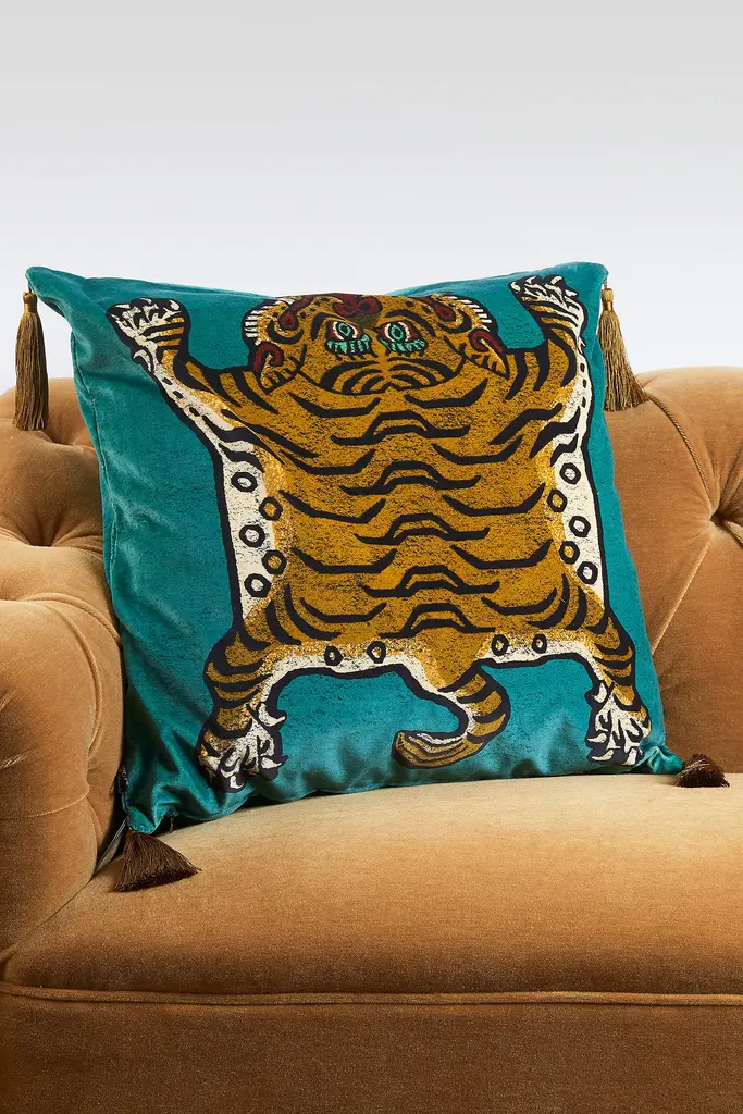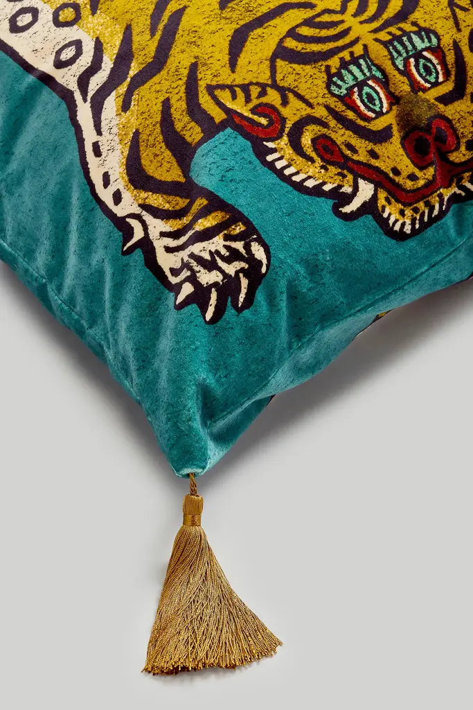 All sales are final, no returns accepted Unleash your wild side with our FLORESCENCE SABER tiger, nestled amongst a meadow of moody blooms, upon this black velvet tasselled cushion. With every one of our Tibetan -inspired pieces sold, we make a donation to Panthera, the organisation devoted to the conservation of the world's wild cats. Outer: 100% Cotton Velvet Filling: 100% British wool Dry Clean Only Imported Dimensions Small: 17.7" x 17.7" Large: 23.6" x 23.6"