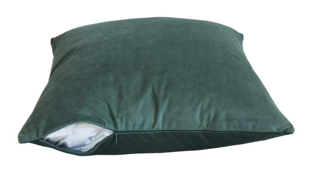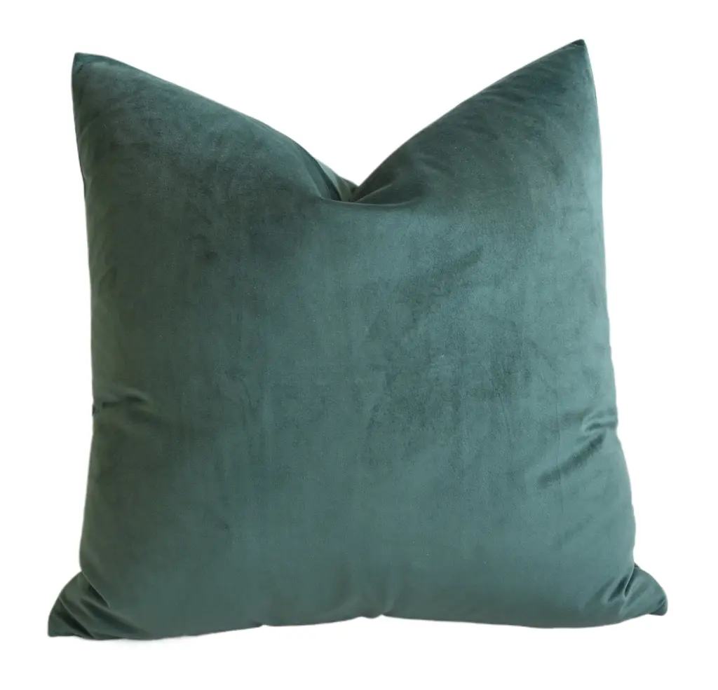 Custom-tailored designer pillow in a cotton blend velvet fabric ina hunter green color. Same fabric on the reverse. Zipper closure. Generous plump goose feather-and-down insert. Excellent new, unused beautiful condition!!!