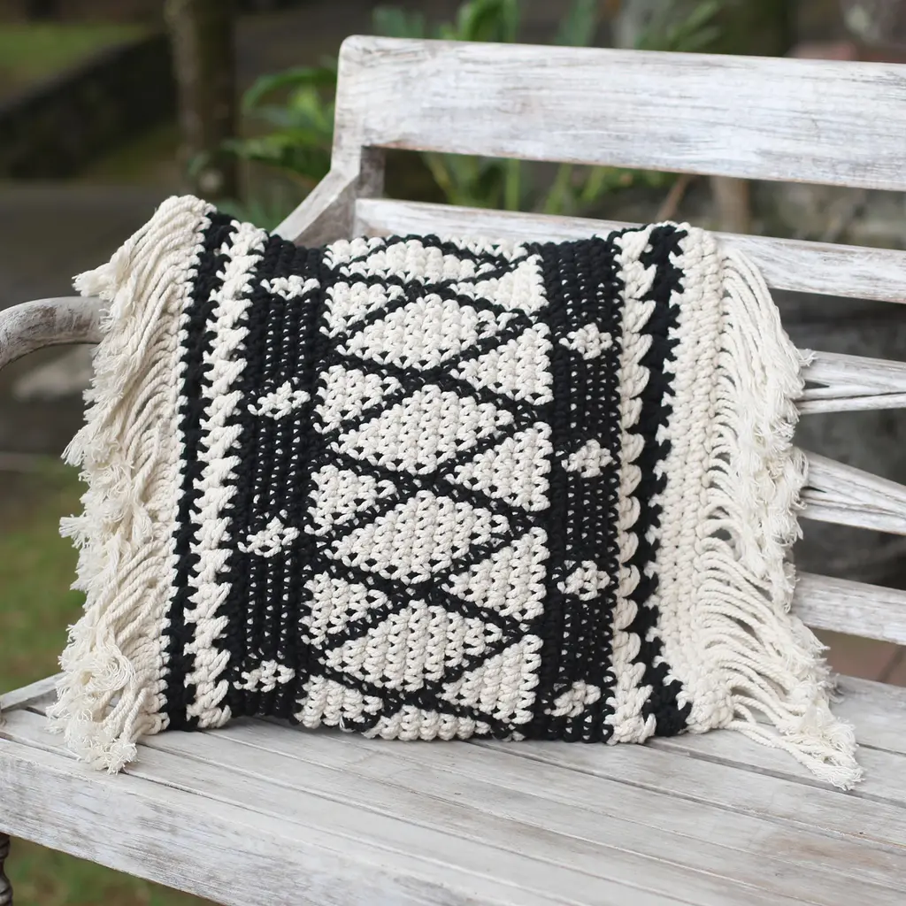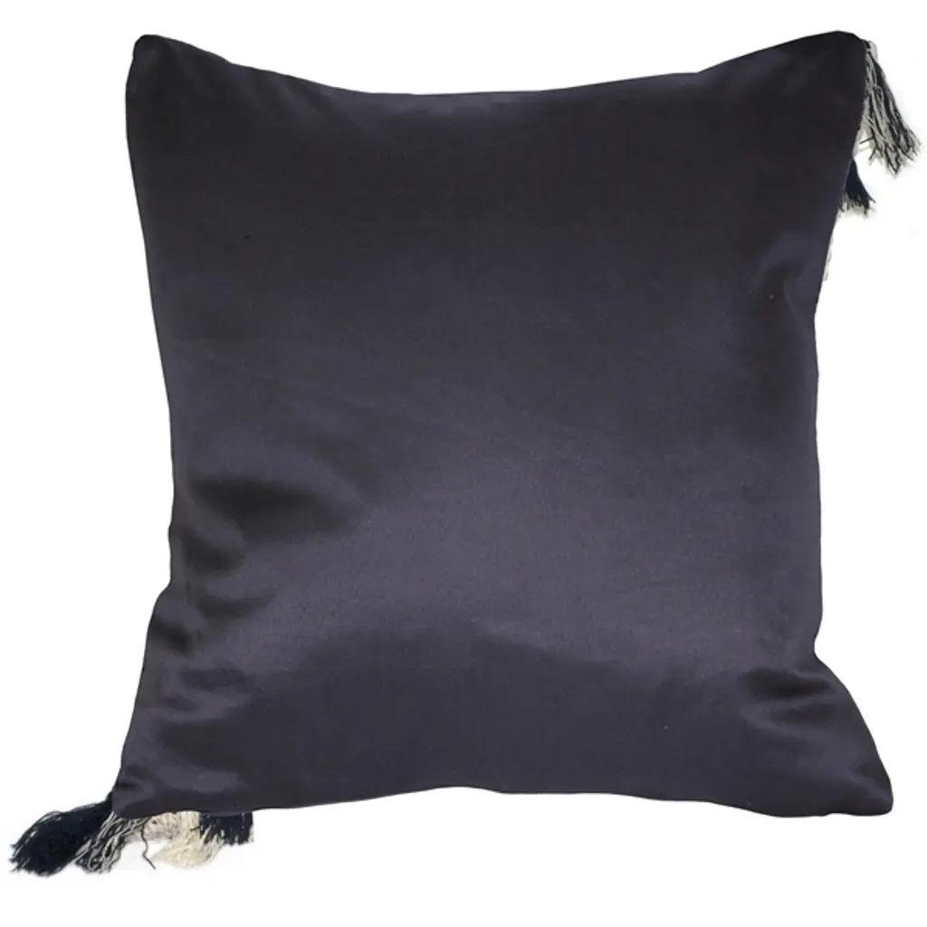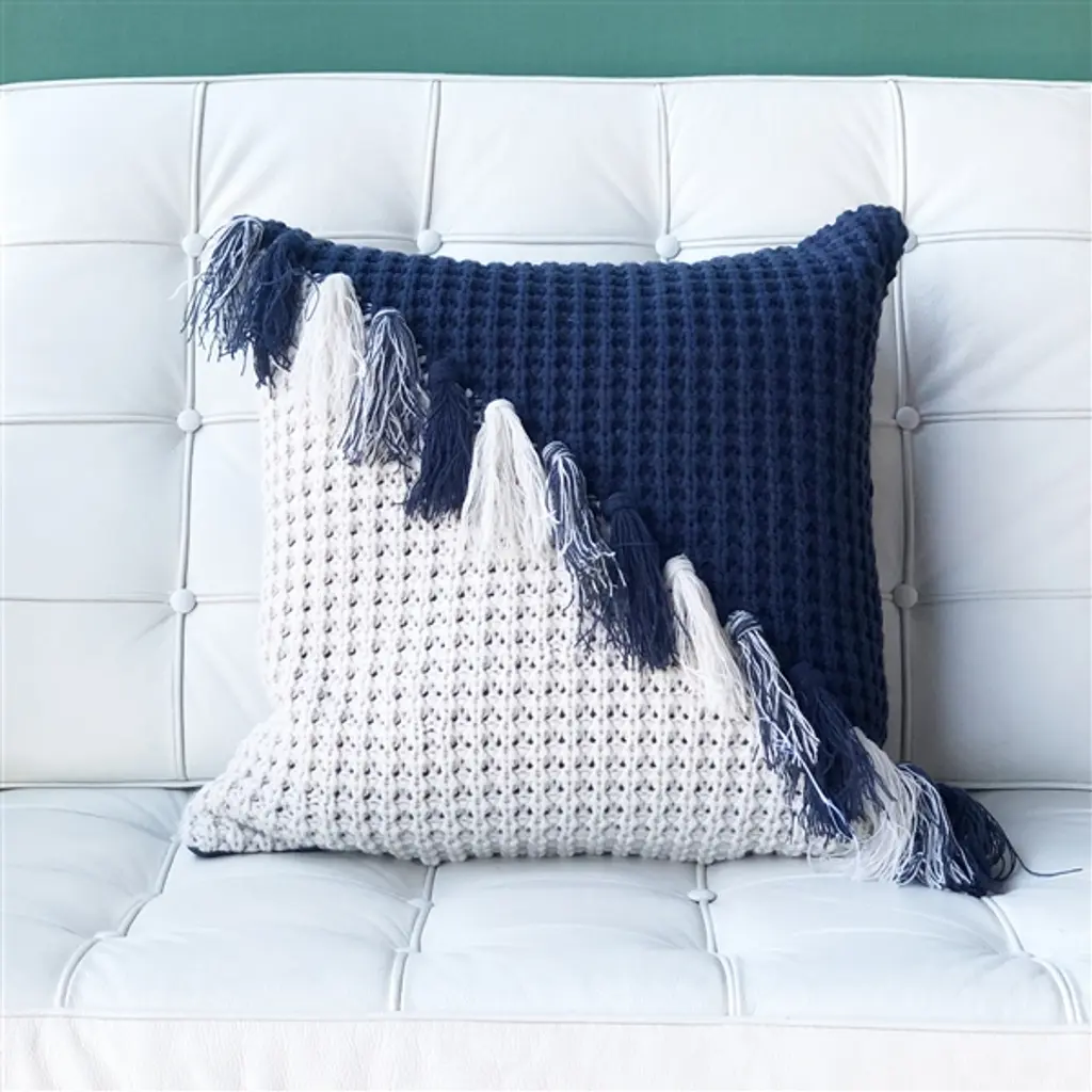 Knitted from soft navy blue and off-white yarn, the Hygge Coast Blue and Cream Knit Pillow has a nautical feel that would make it a great addition to a beach house or coastal cottage. Tassels hang across the diagonal like telltales on the sails of a boat. The pillow is backed with a dark blue, smooth woven fabric. Size: 18"x18" Square Fabric: 100% Acrylique Knited front only/back in matching color woven fabric Hidden zipper closure Cold water wash separately, tumble dry low Made in Canada: Designed and made in Pillow Decor's Vancouver workroom.