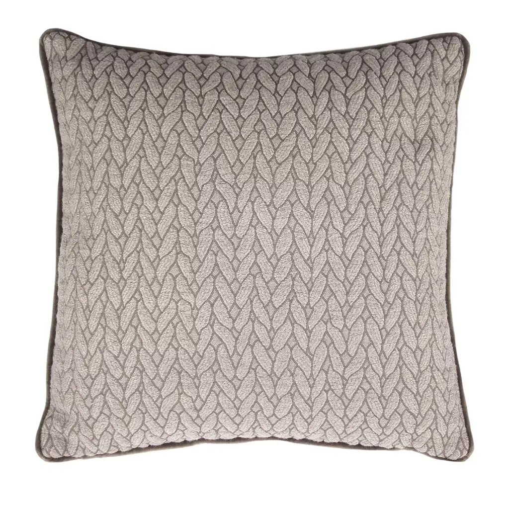 The pattern in the Hygge Winter Field Cross Knit Pillow is consistent throughout but changes from a solid charcoal gray across the bottom to a mixed gray and off-white across the top. This soft, neutral tone pillow is accented by corner tassels and is backed with a matching dark gray woven fabric. Size: 18"x18" Square Fabric: 100% Acrylique Knited front only/back in matching color woven fabric Hidden zipper closure Cold water wash separately, tumble dry low Made in Canada: Designed and made in Pillow Decor's Vancouver workroom.