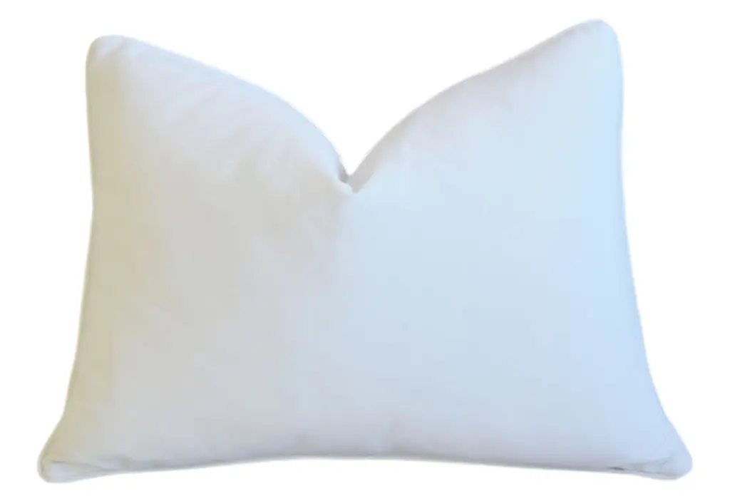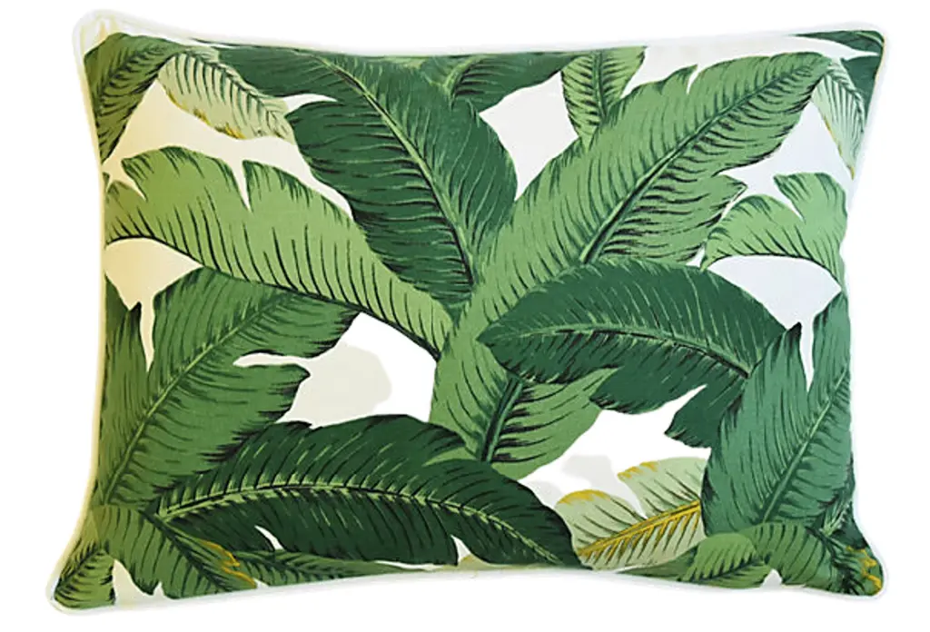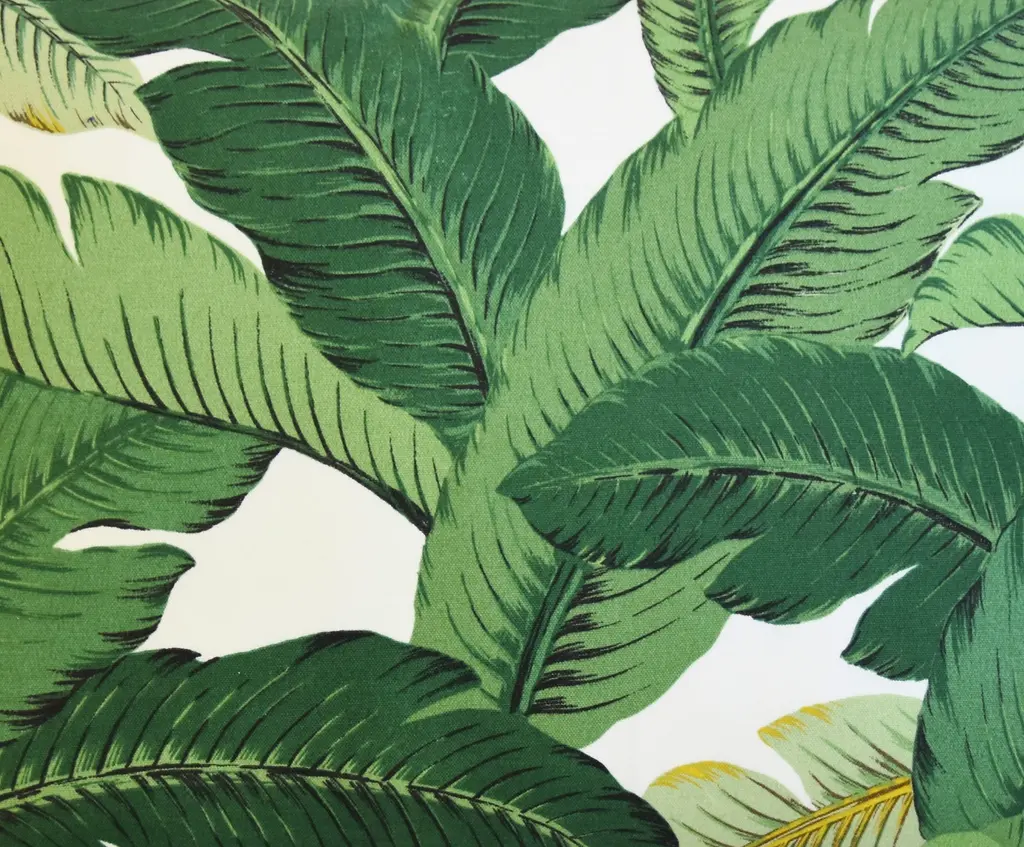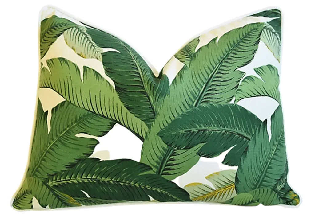 Custom-tailored pillow in cotton fabric with an iconic banana leaf design. White-colored cotton-velvet back. Custom cord trim. Zipper closure. New plump goose feather-and-down insert.