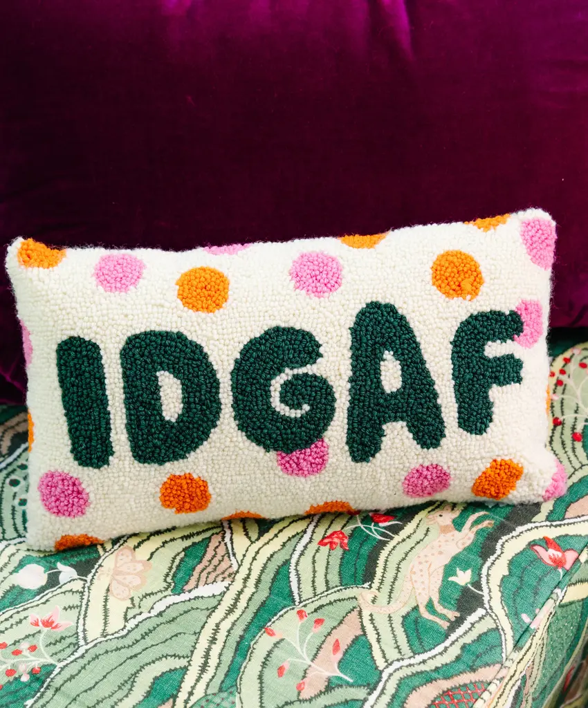 For the ones who’ve run out of damns to give. This pillow is for anyone thriving in their zero-tolerance, high-confidence, unapologetic era—IDGAF and loving it. Embrace the latest joy-inspired decor movement, and transform your home with Furbish Studio’s Needlepoint and Statement Pillows. Our pillows feature vibrant patterns, playful prints and uniquely-you sayings that spark happiness and guarantee LOLs – because your home should make you smile every day. Make a statement with this charming-meets-chic pillow. With over 100 styles to choose from, they are sure to spark joy, plus they make the perfect gift! Check out the full collection here. Measures 9" x 16" - Small pillow, big statement!