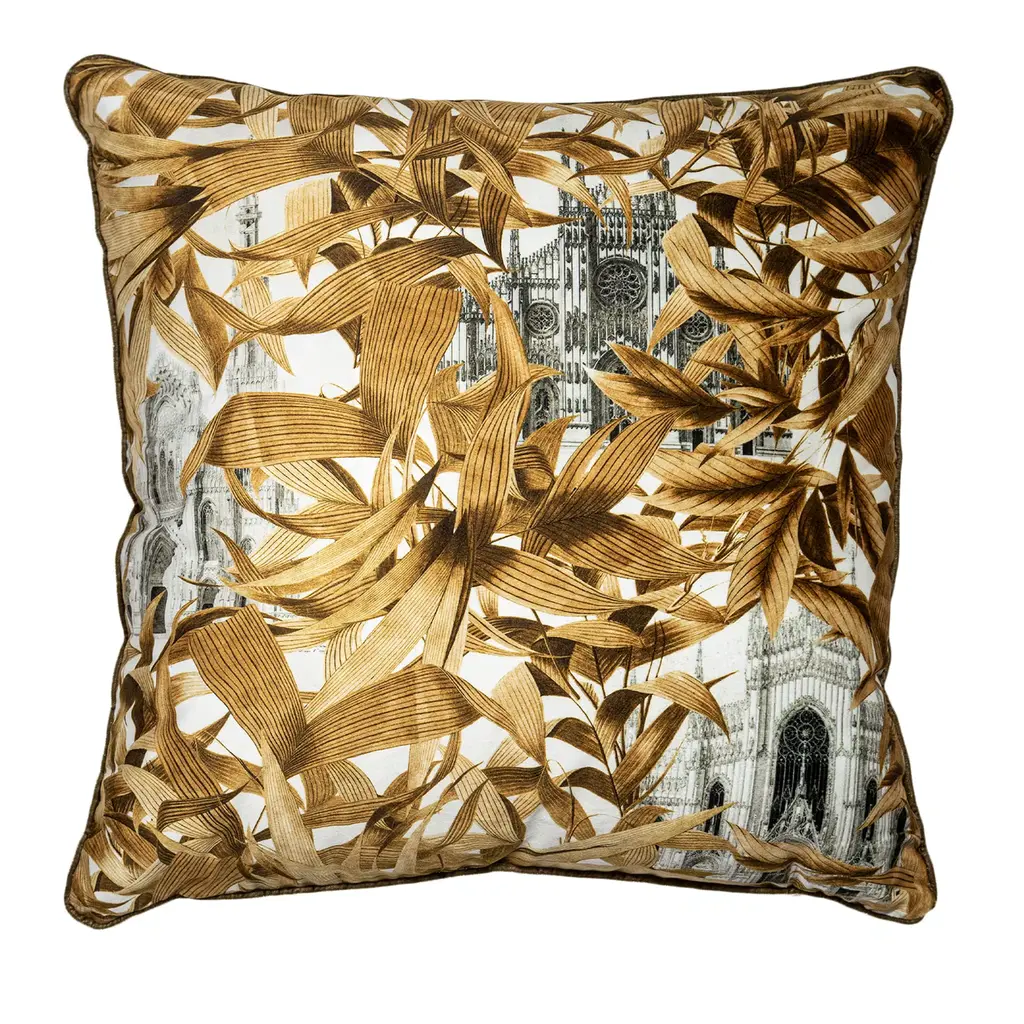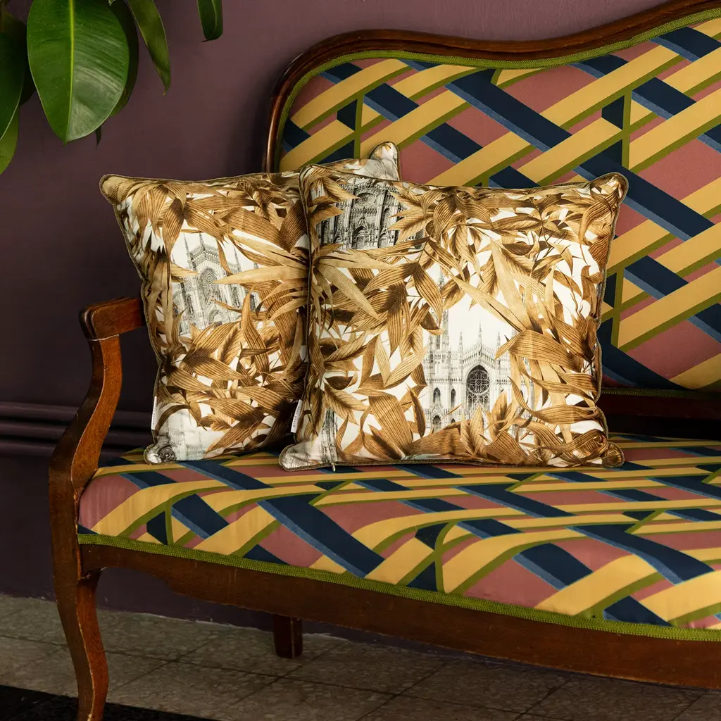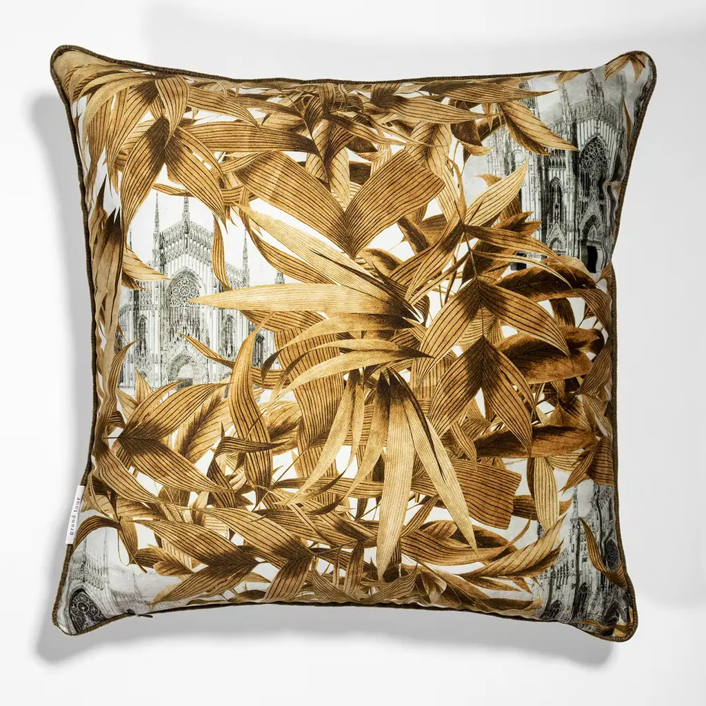 This cushion is part of “Il Duomo che Non c’è” Collection, a selection of the most evocative designs that were proposed in the 19th century for the reconstruction of the cathedral’s facade, enriched with yellow palm leaves, once the plants that were planted in the flower beds in front of the Duomo. The honor of having been able to work on these precious materials, never seen before today, makes this project unique and exciting.