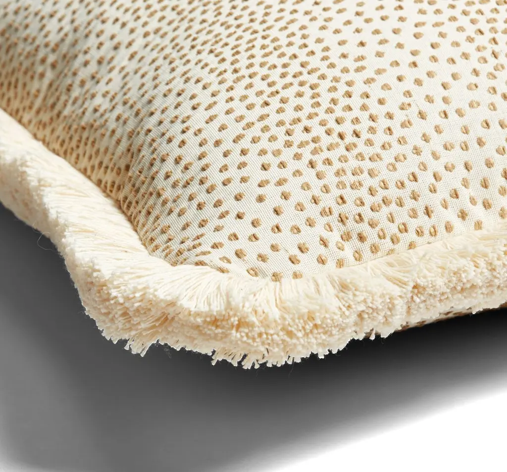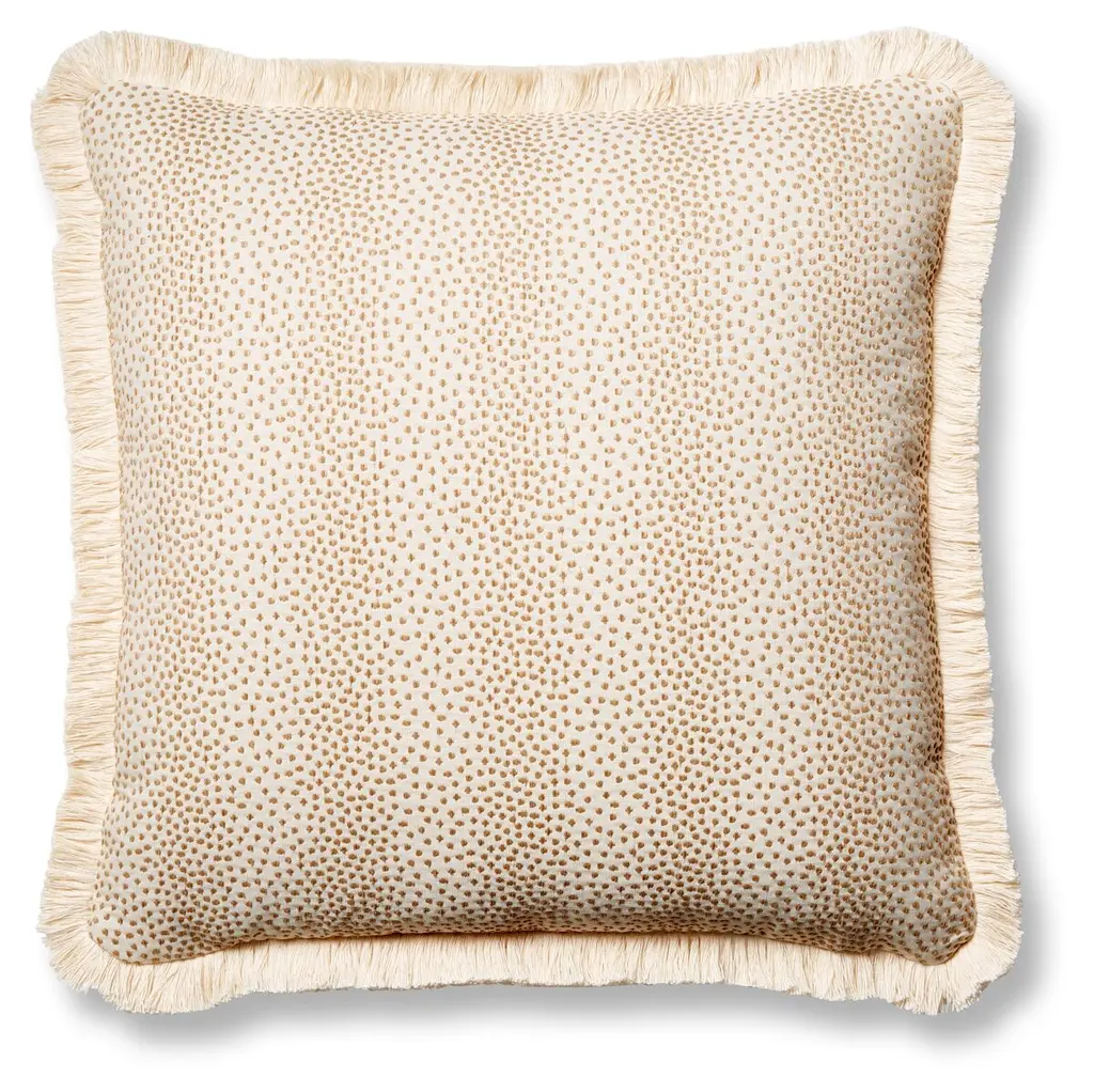 Designed by us and available only at One Kings Lane: A playful dot pattern pops in tan on the beige ground of this plush pillow; coordinating fringe completes the design with plenty of personality. Insert included. Zipper closure.