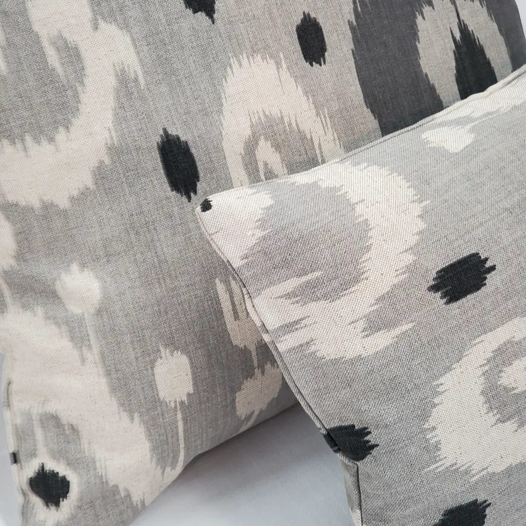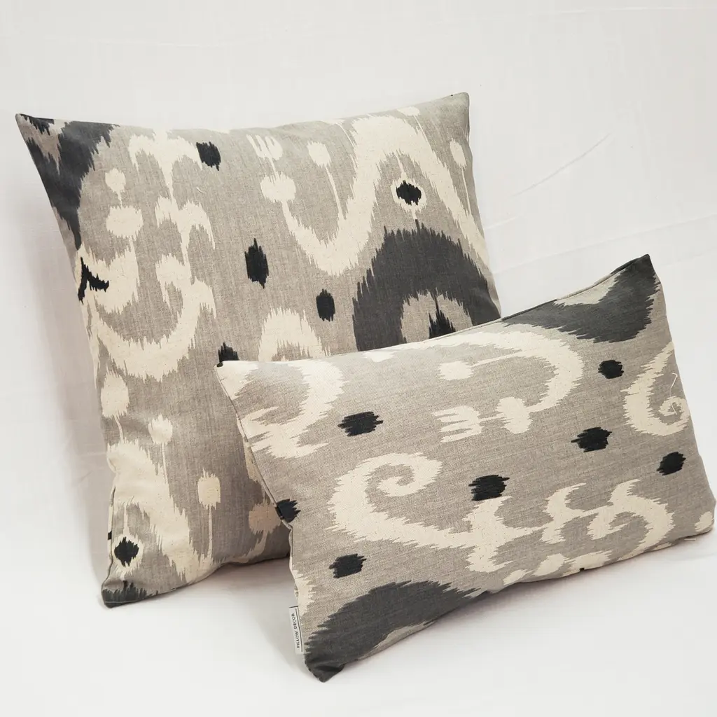 Indah, meaning beautiful in Indonesian, is the only way to describe this gray 20 inch square ikat throw pillow. The pattern on these pillows is a contemporary take on a classic Indonesian ikat design. Although traditional ikats are rarely so monochromatic, the charcoal, gray and off white shades in this pillow make it ideal for so many modern and contemporary decor styles. Size: 20"x20" Square Fabric: 80% Cotton / 20% Polyester Same fabric front and back Knife edge seems Color matched, hidden zipper closure Dry clean only Made in Canada: Designed and made in Pillow Decor's Vancouver workroom.