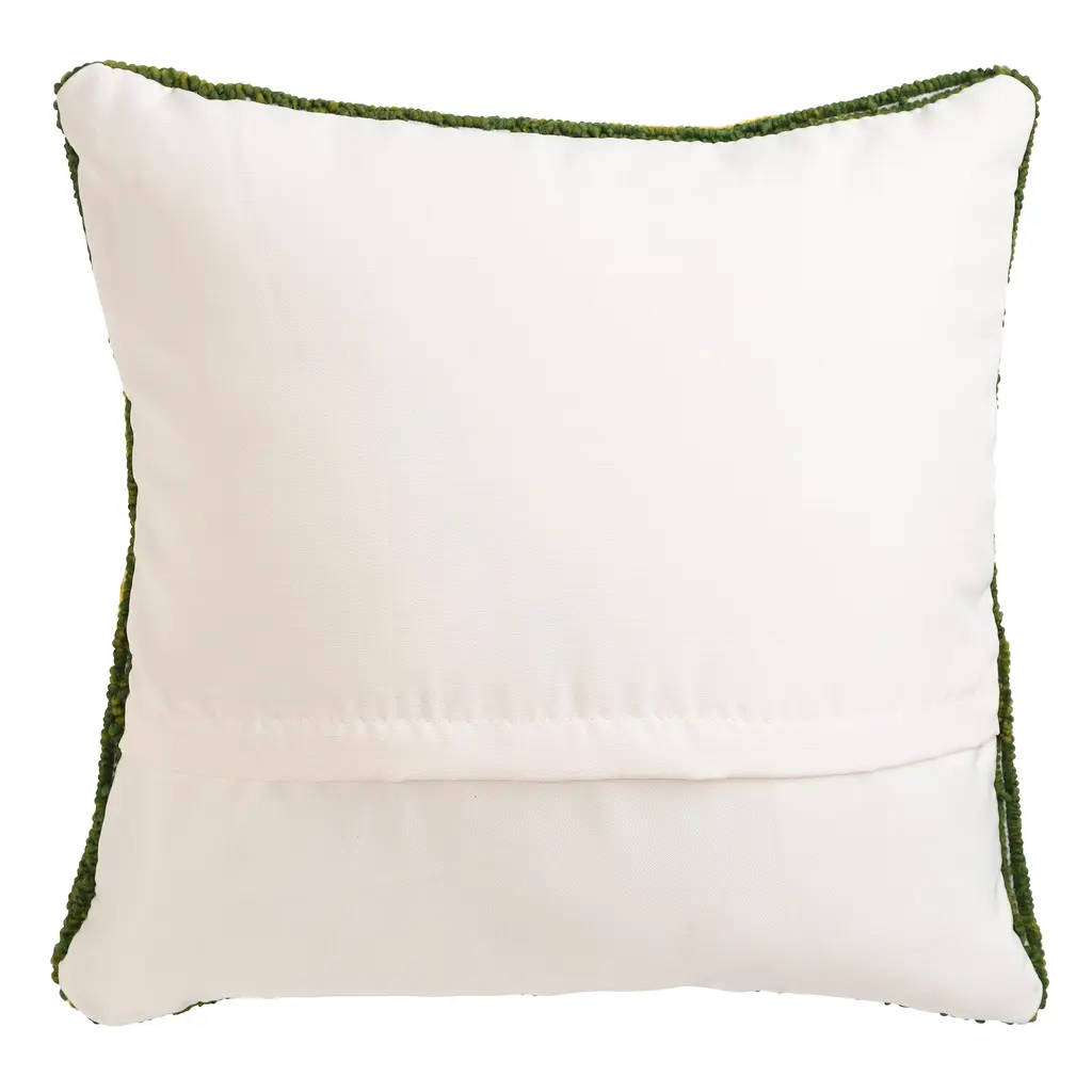 Everyone loves sunflowers, and our Indoor/Outdoor Sunflower Hooked Polypropylene Throw Pillow will give your family and guests something to smile about. The pillow features a single colorful sunflower with green foliage that pops from a lighter background, surrounded by a green border. The design comes to life thanks to the detailed hooked pillow face with variations in color and a wonderful texture. Crafted of all-weather polypropylene, this accent pillow is mildew and fade resistant, safe to be used indoors or out. It lends a dash of cheer to your patio, porch or anywhere inside your home. Polypropylene toss pillow has a zippered cover, polyester fiberfill and poly-canvas backing. Shake out or vacuum (do not use beater attachment) as needed. Spot clean with a mild soap/water solution or hose down, then air dry. May also be machine washed. Imported.