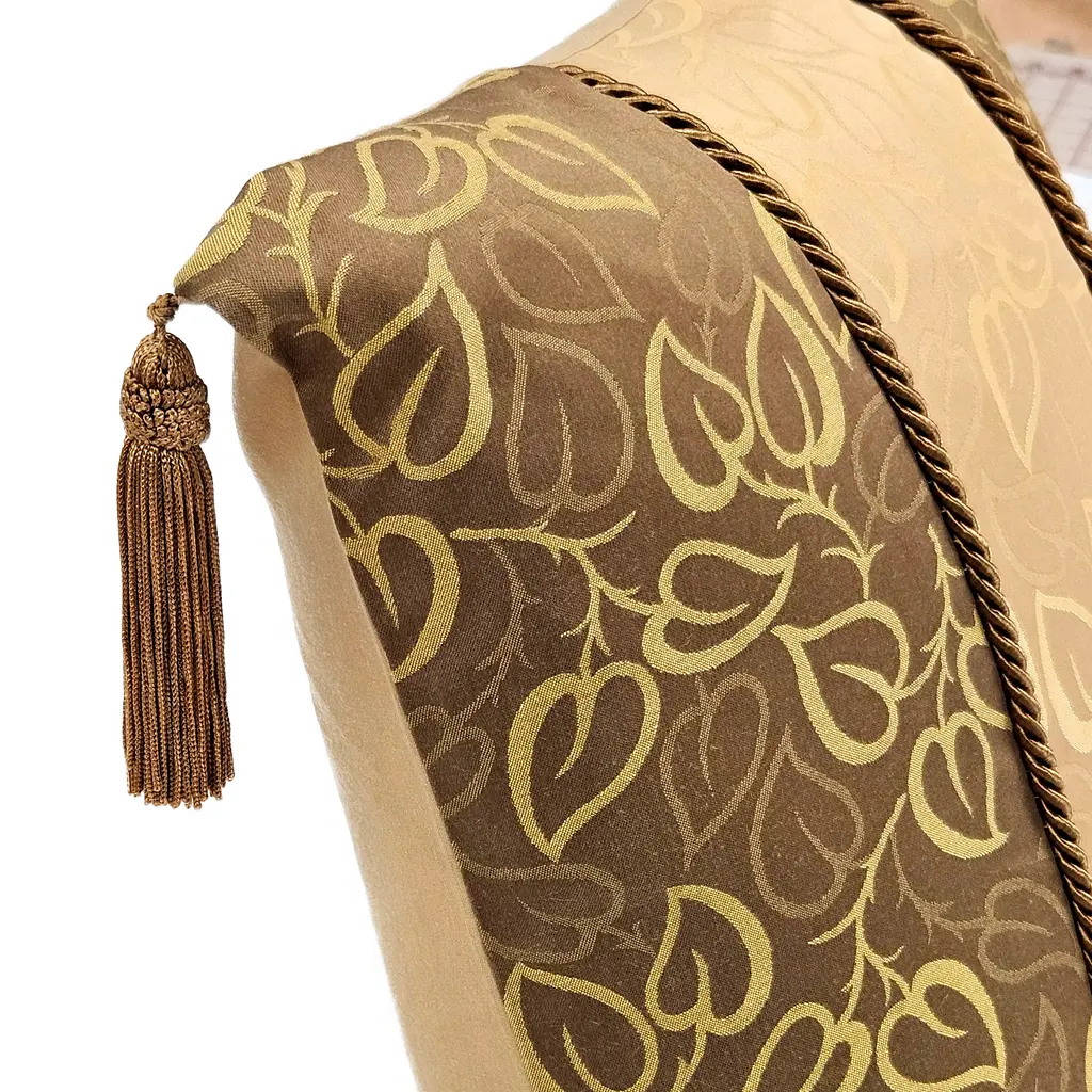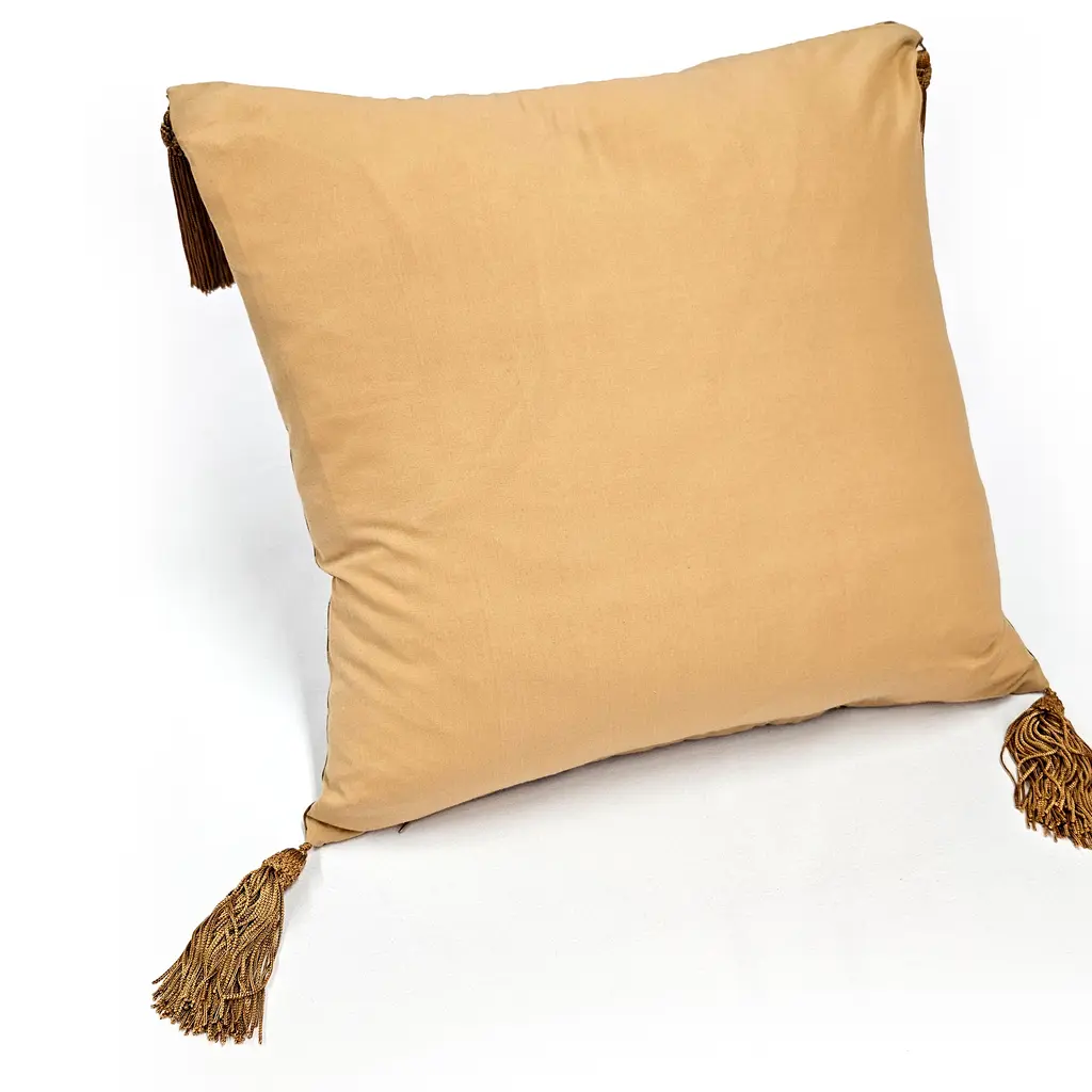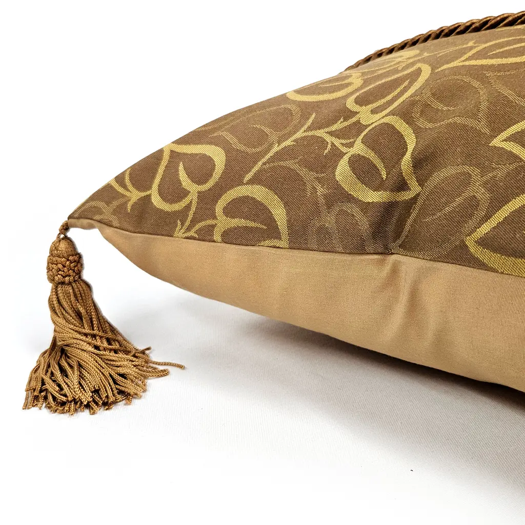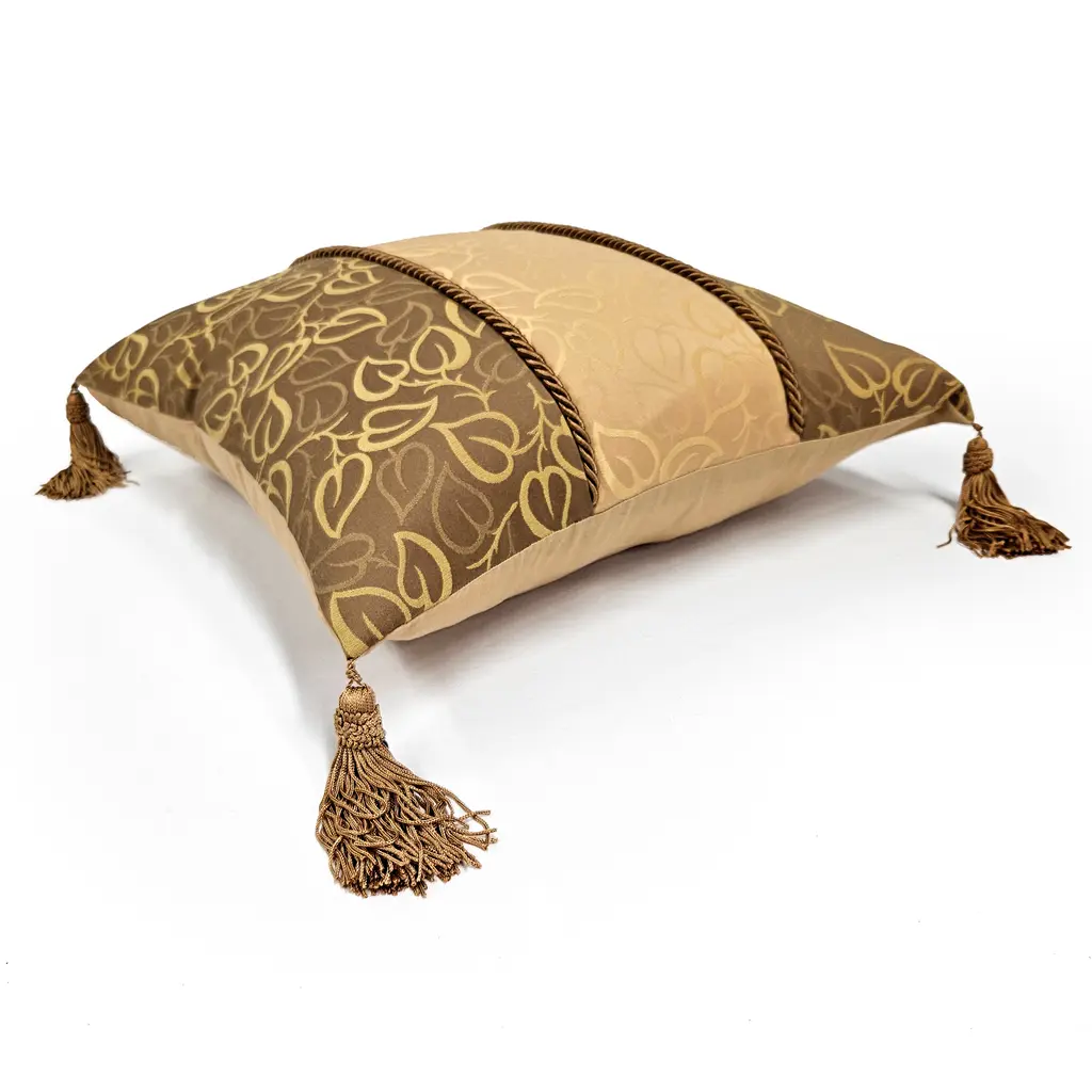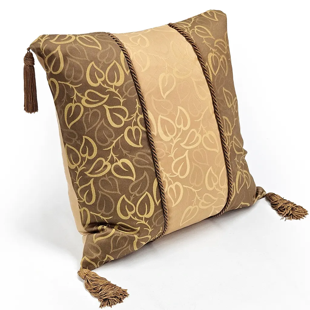 The Indravati Gold Leaf Throw Pillow showcases a stunning design in rich, earthy tones of brown and gold. The front features two distinct sections of fabric adorned with an abstract, leaf-like pattern in gold. Decorative twisted cord trim separates these sections, adding a touch of elegance to the design. Four generously sized tassels in a matching gold-brown tone are attached to each corner, giving the pillow a classic, refined look. Perfect for adding a sophisticated flair to your living room, bedroom, or office, this pillow combines intricate details with a warm, inviting palette. It measures approximately 17 inches, making it ideal as a statement piece on a couch or an accent on a bed. Size: 17"x17" Square Fabric: 100% Polyester Back of pillow in coordinating solid color fabric Copper corner tassels Knife edge seams. Hidden zipper closure in bottom seam of pillow cover Dry Clean Only
