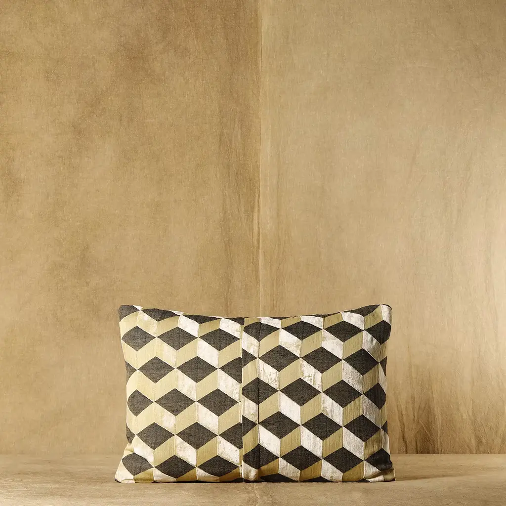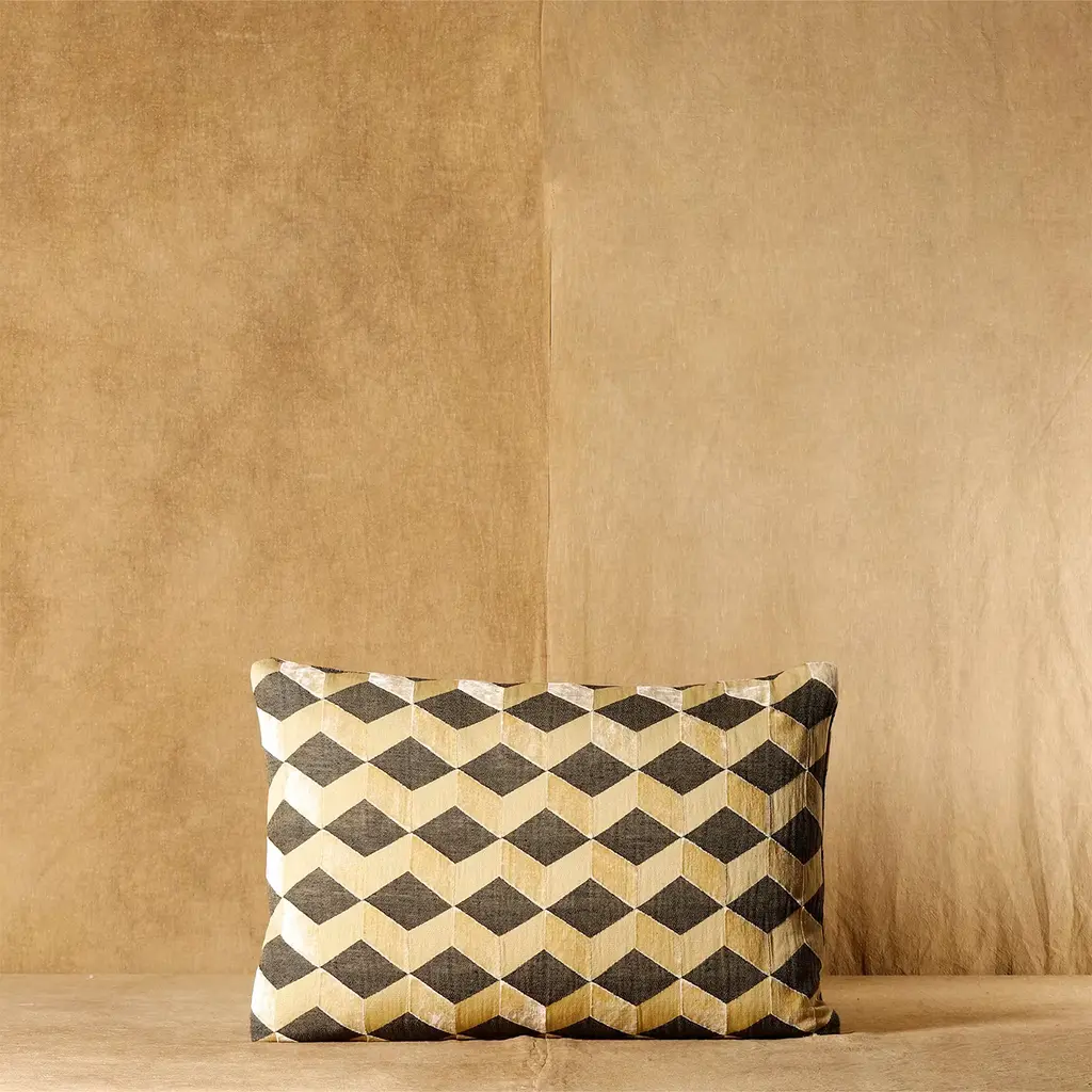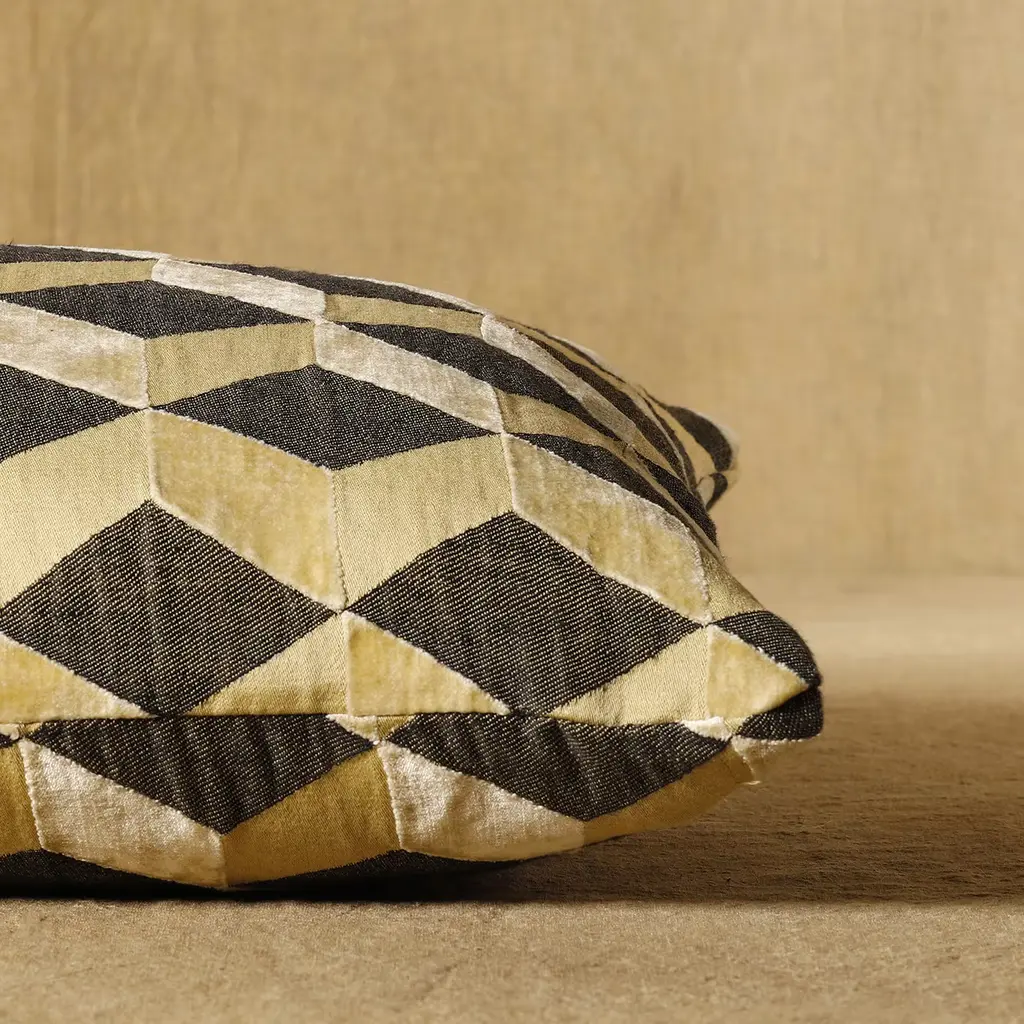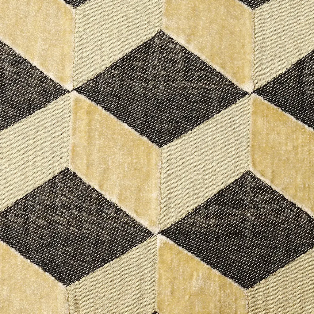 The jacquard pattern of the Ingannevole, made with a mix of cotton, linen, and viscose fibers, tricks the eye with a bas-relief illusion. The muted yellow hue lends a dramatic effect that exists between shadows and fiction.