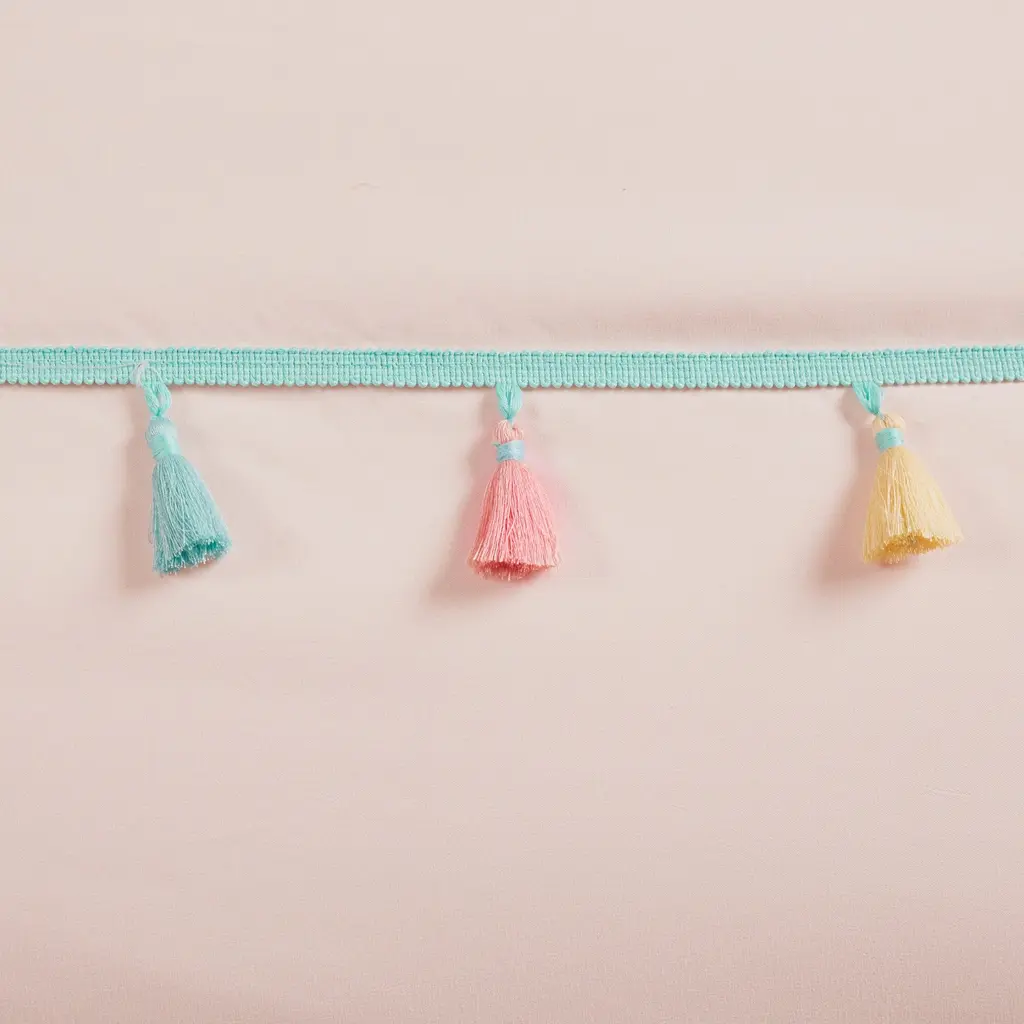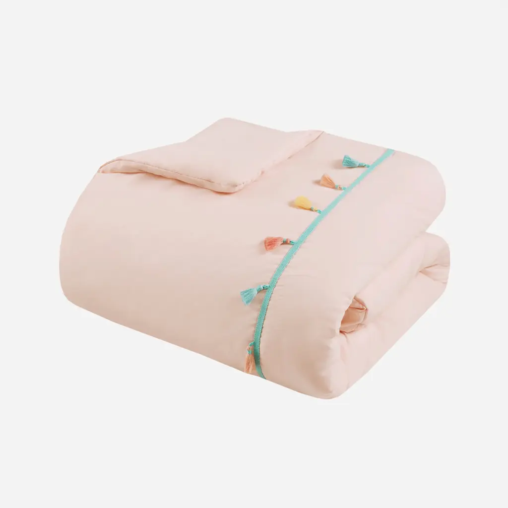 The Intelligent Design Kids Tessa comforter features multi-colored tassels that add a charming detail to this bedding set. Cute and simple, the comforter offers a fun update to your kid's bedroom.Features:Twin Dimensions: Full/ Queen Dimensions: