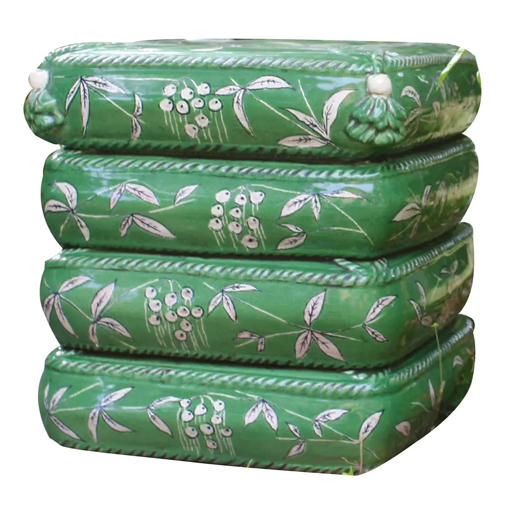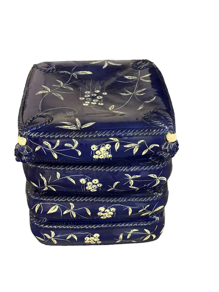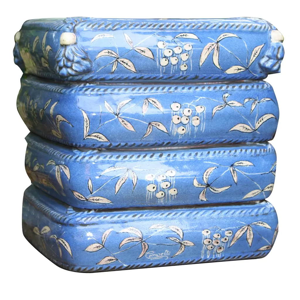 Italian Ceramic Pillow Stack Stool Or Garden Seat In Ink Blue Leaves Design