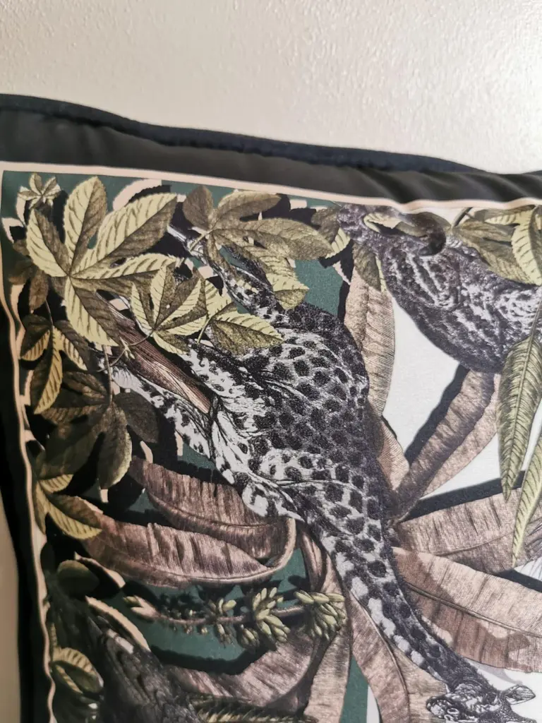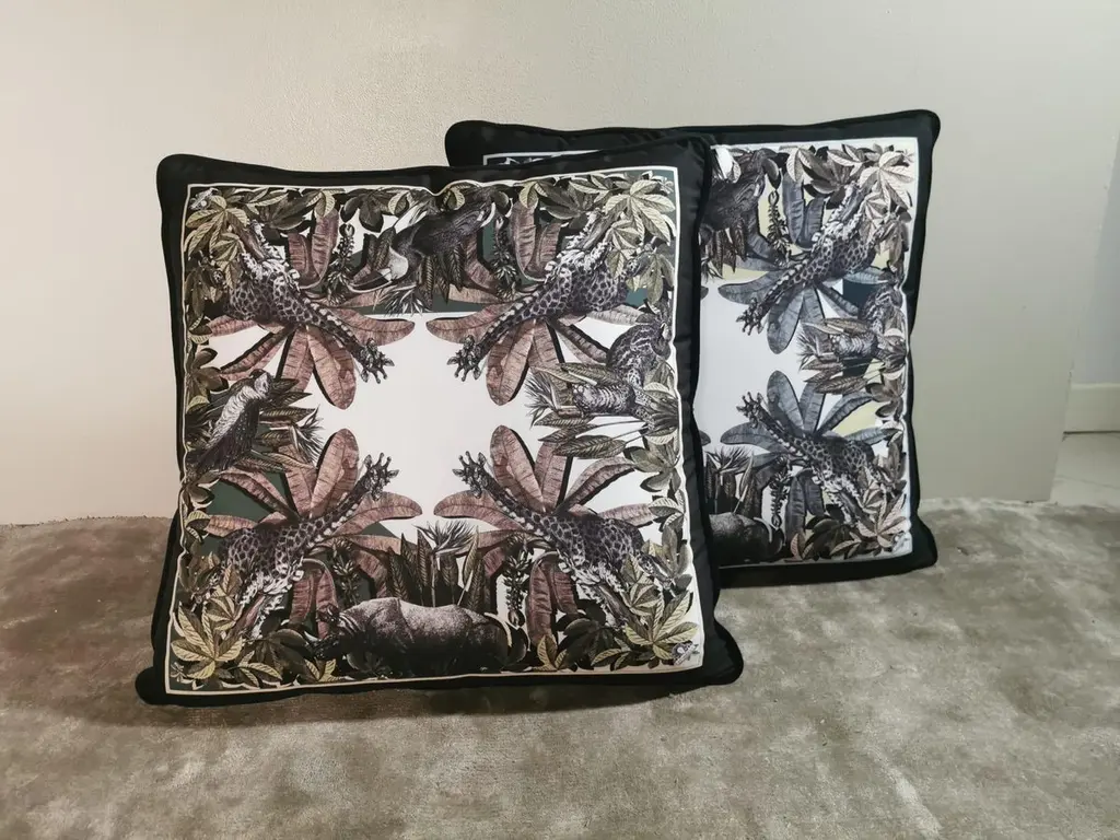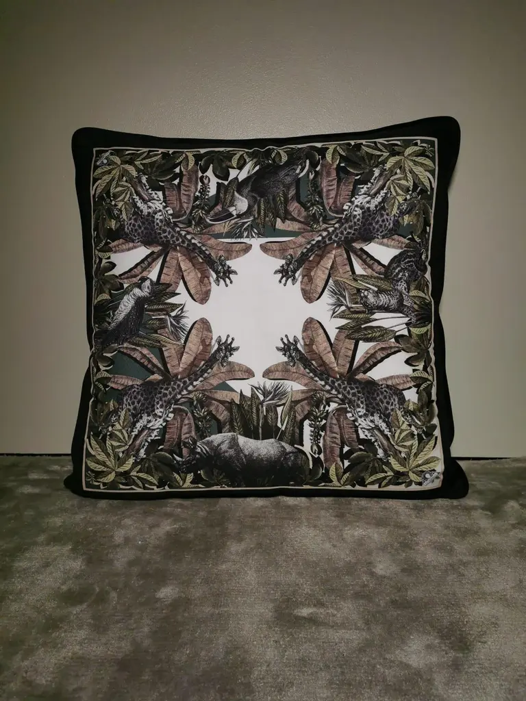 A velvet and polyester pillow showing an exotic natural setting with animals - This pillow comes out as a set of two but is also available as individual. It belongs to the "Black and Wild" collection which is created by our own designer and available in several different designs and sizes. Perfect to give a refined touch to your rooms. About us: "Artecornici design" produces hand-colored art prints, artisan frames, lightings, decorative accessories and furniture. All our products are designed and produced in Florence by Italian master craftsmen.We have a 40 years tradition in hand carved and handmade frames . Our long experience and constant renewal in this field have permitted us to expand our line to include furniture, lightings, and decorative accessories.