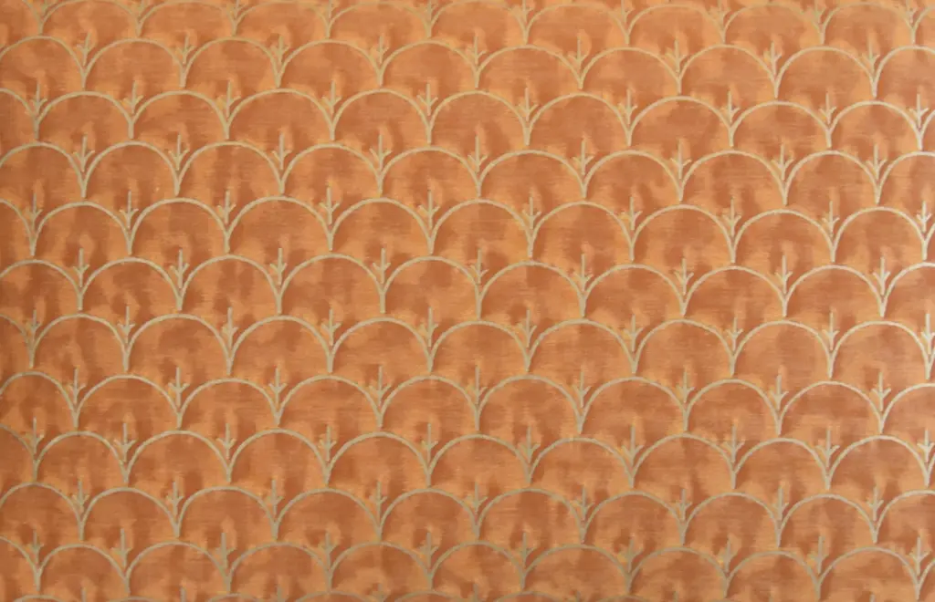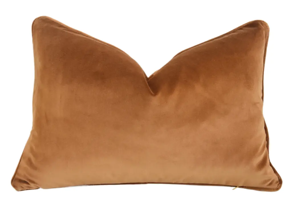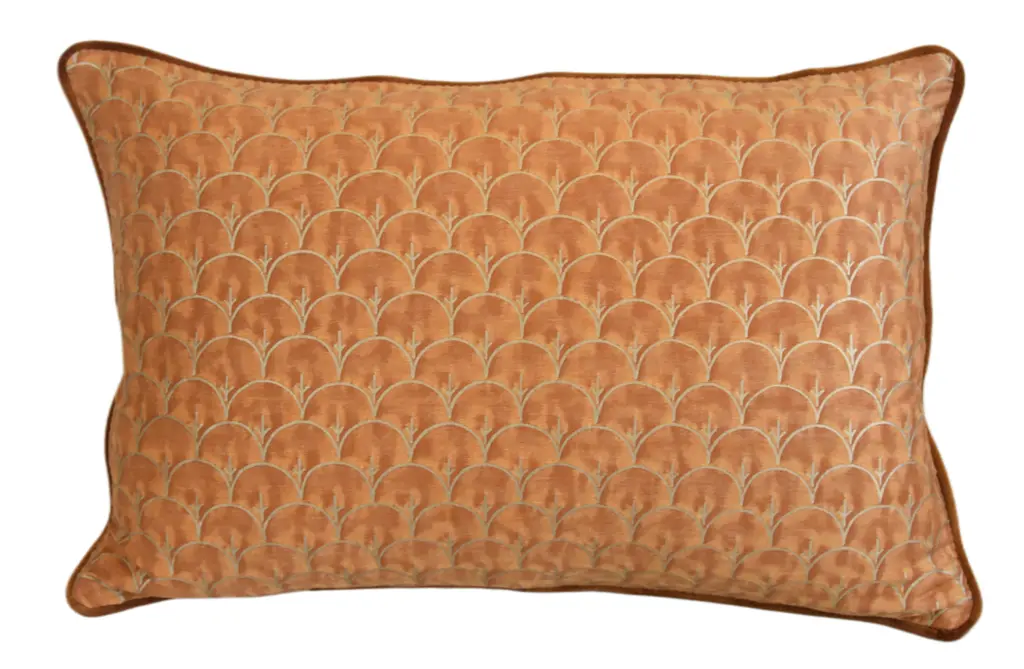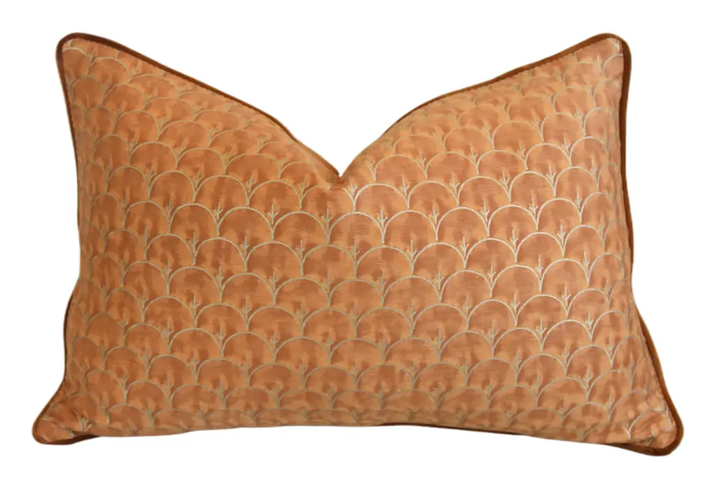Custom-tailored pillow in Italian designer Mariano Fortuny's premium Egyptian cotton fabric called "Arboreto" in a beautiful burnt peach and silvery-gold colorway. The design was created in 1940 in the twilight of Mariano Fortuny’s long career as an artist and dreamer. The pillow reverse is a complementary velvet fabric. Custom cord piping trim. Hidden zipper closure. Plump, generous goose feather-and-down insert. Excellent new, unused condition!!