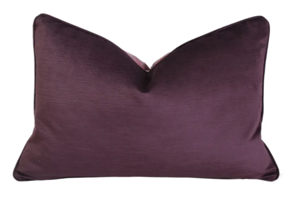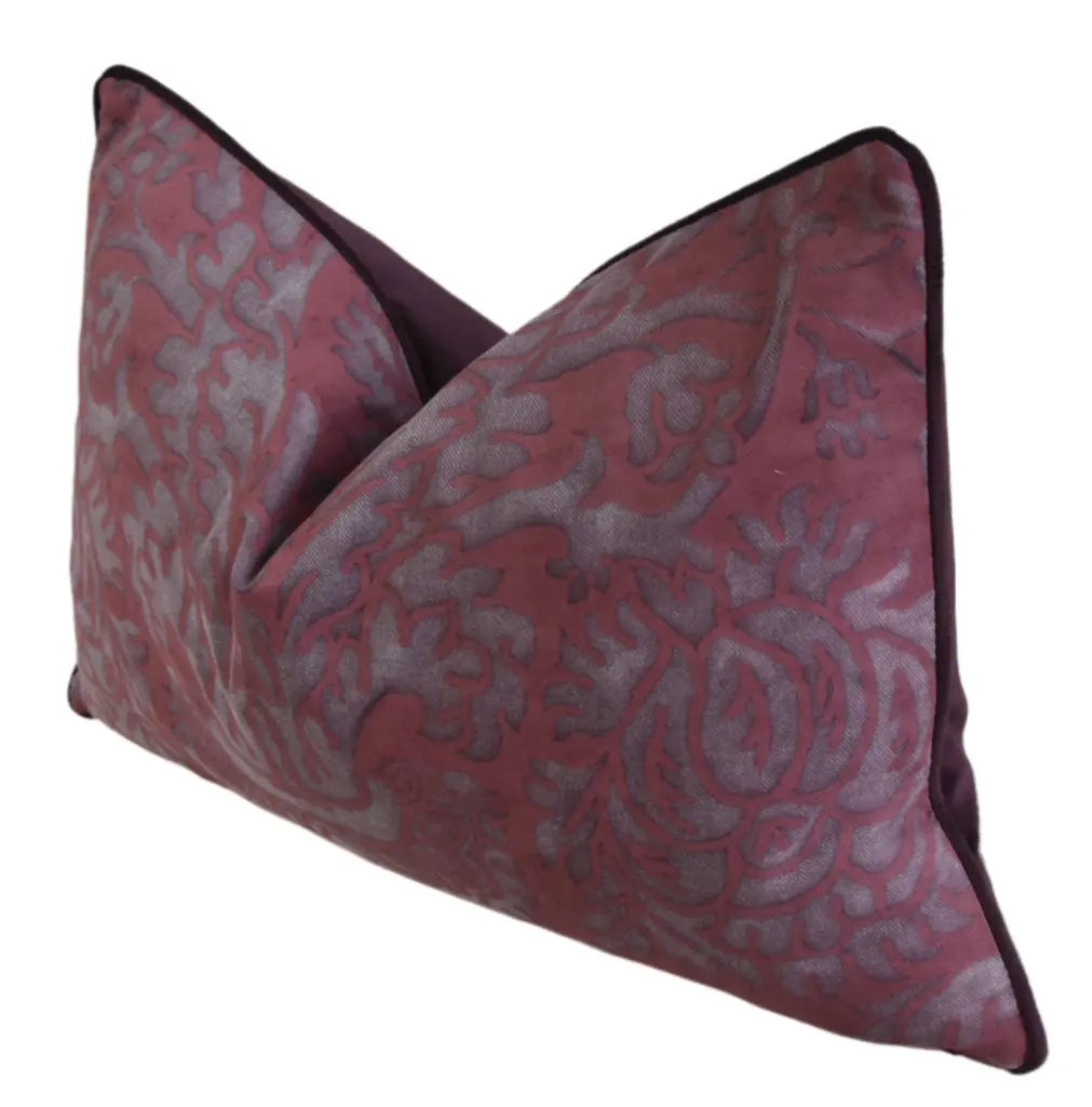 Custom-tailored pillow by Mike Seratt of The Prized Pig in Italian Mariano Fortuny cotton fabric called "Barberini" in blackberry texture colorway. The Barberini family was an Italian noble family that rose from Florentine merchants to the Papal seat in the 17th century. Complementary velvet fabric back. Custom cord trim. Zipper closure. Generous goose down/feather insert. All pillows in this listing have identical pattern placement on the front. Excellent new, unused condition!!