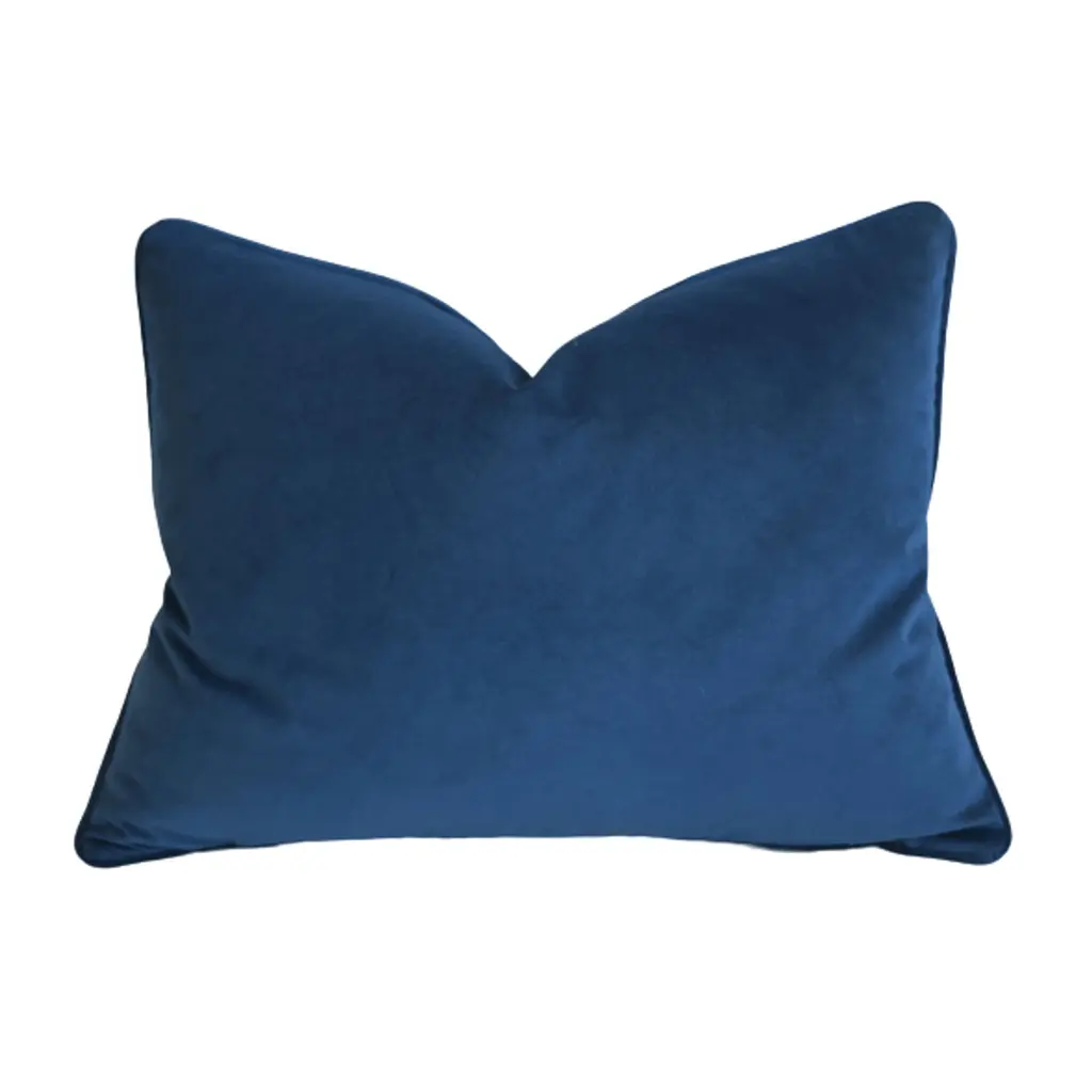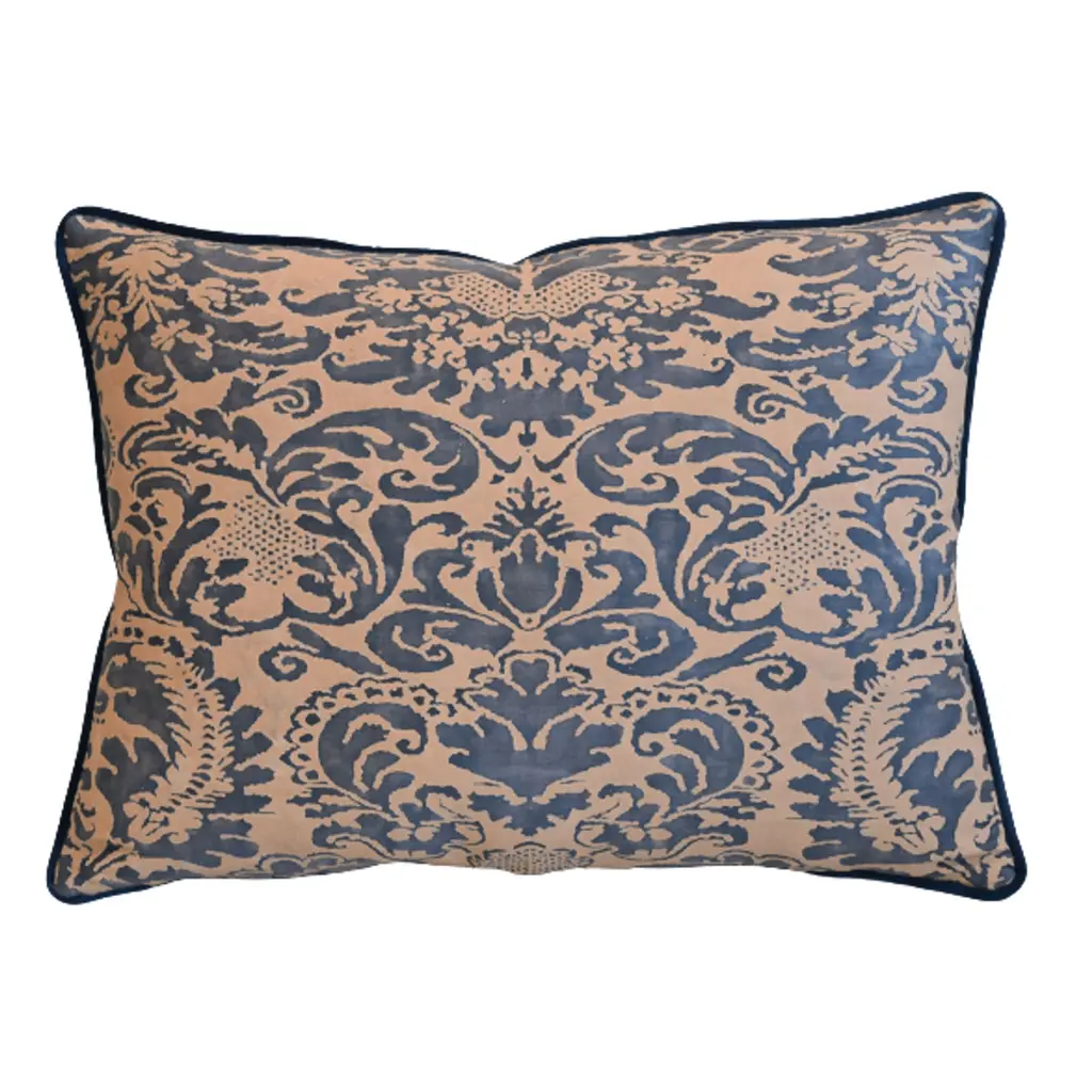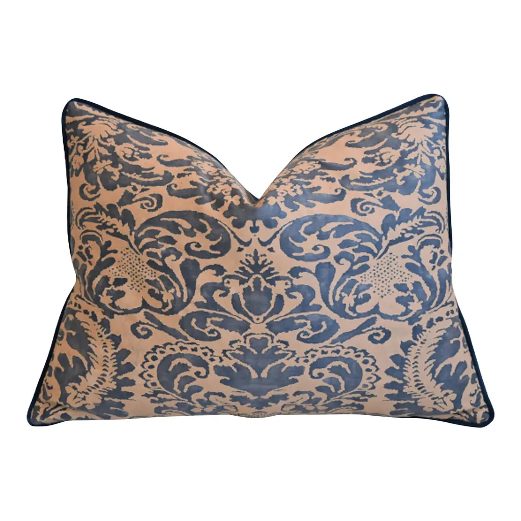 Custom-tailored pillow in Italian Mariano Fortuny cotton fabric called "Corone" with a rich dark blue and beige-tan colorway taken from a 17th-century design. Blue cotton-velvet fabric back. Custom matching cord trim. Zipper closure. New generous goose down/feather insert. Excellent new unused condition.
