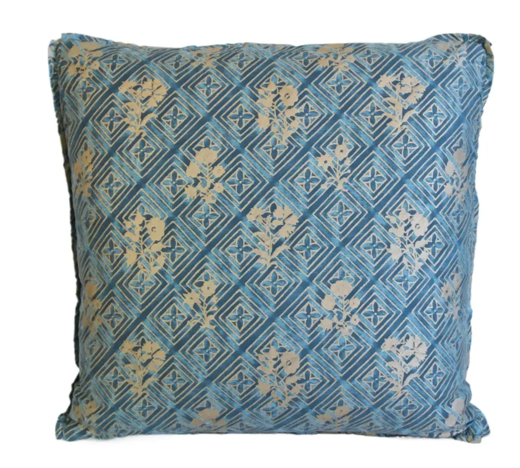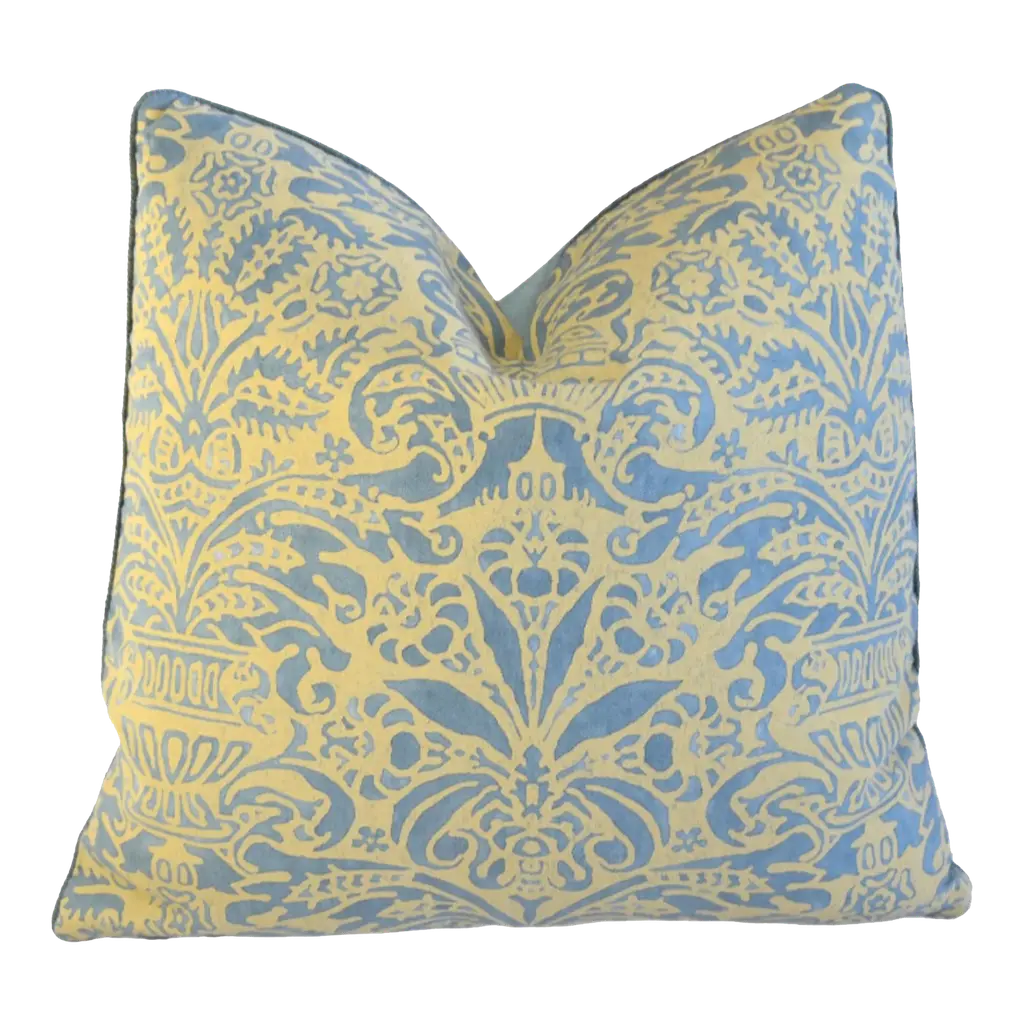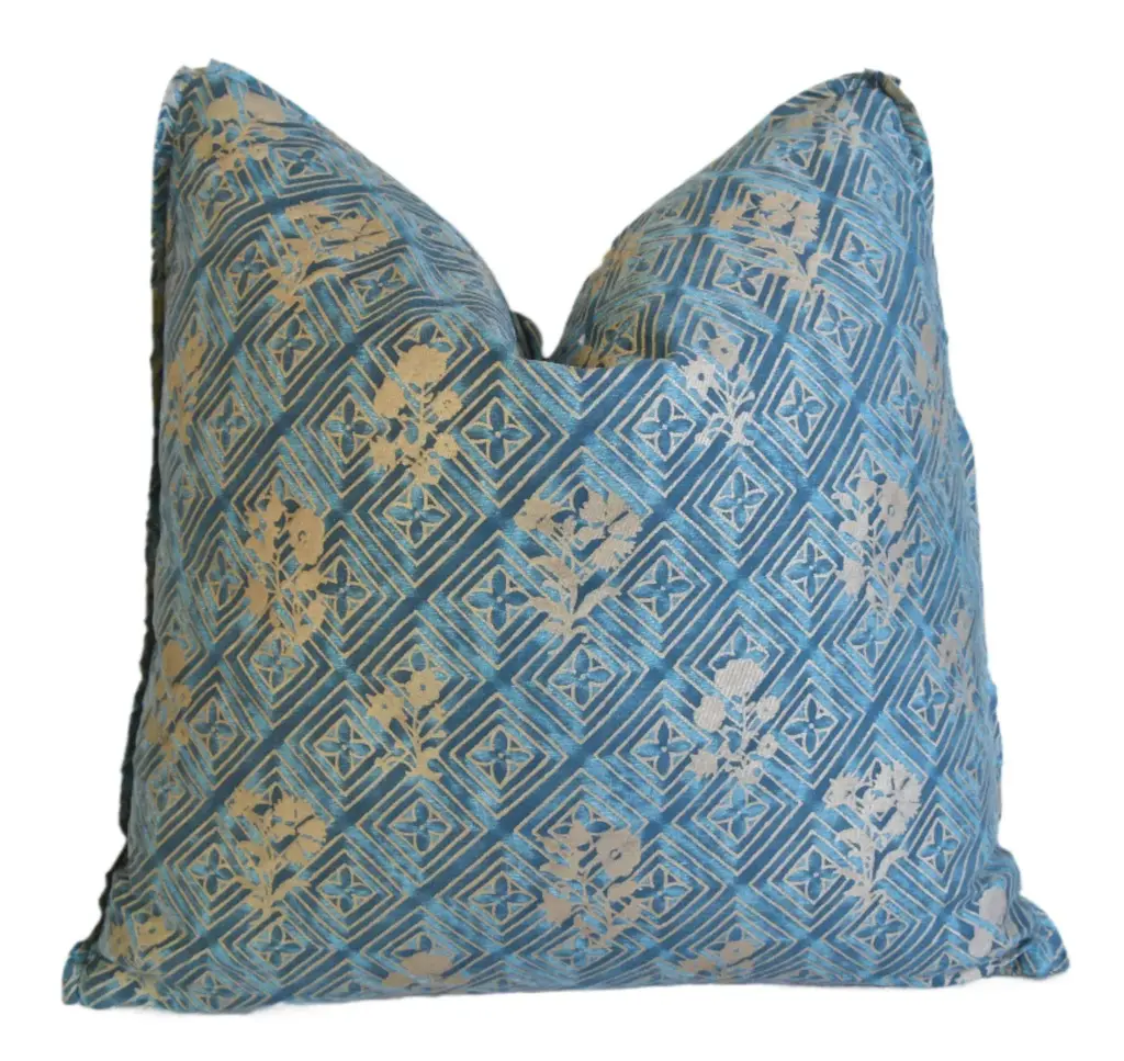 Custom-tailored pillow in Italian designer Mariano Fortuny's cotton fabric called "Jupon Bouquet" in a beautiful blue and silvery-gold colorway. The design was inspired by a 16th-century French Parisian floral. The pillow reverse is the same Fortuny fabric. Custom pinched corner flange trim. Zipper closure. Plump, generous goose feather-and-down insert. Excellent new, unused condition!! ***PLEASE NOTE: I will combine shipping whenever possible if you purchase multiple items from my shop. Warm regards, Mike Seratt. ***Also don't forget to take a peek at my other current listings...you just might find something you can't live without!!! It's easy just click on my name to the right of any listing highlighted in black "Mike Seratt of The Prized Pig" and presto it will bring you to my storefront!!! Cheers!!! I SHIP OUT IMMEDIATELY, SO THE ESTIMATION YOU SEE FOR THE DELIVERY TIMELINE IS CHAIRISH'S OVERALL GENERAL TIMELINE, BUT I WILL GET THIS OUT THE NEXT DAY AND DELIVERY IS USUALLY 5-7 DAYS AT MOST
