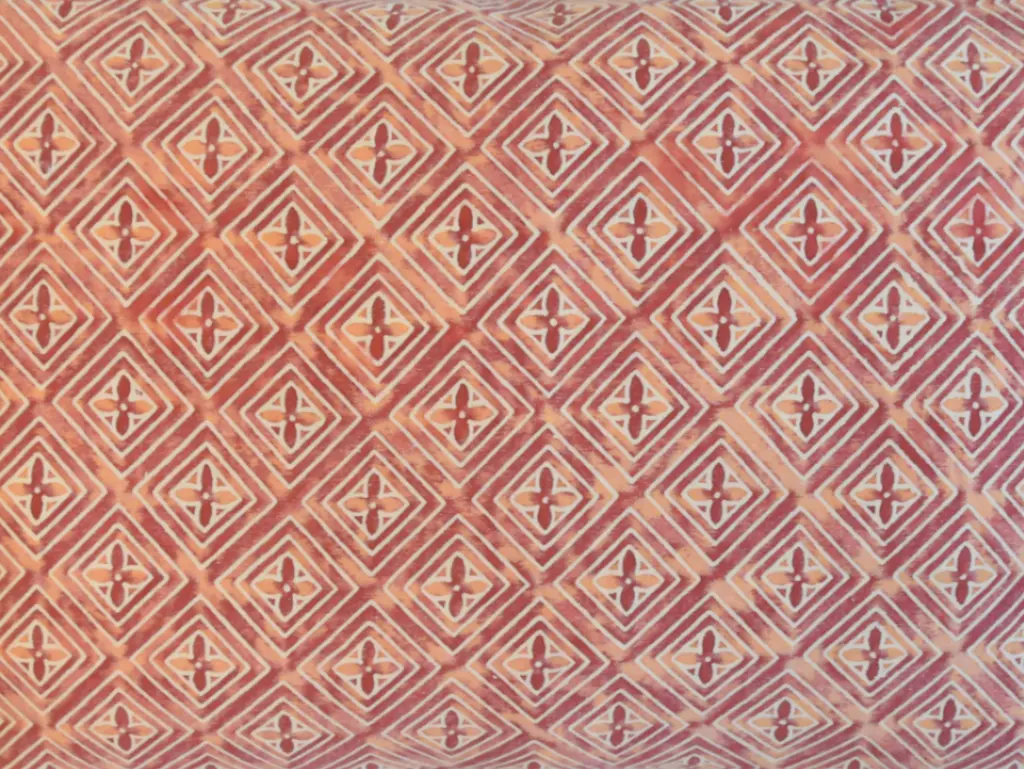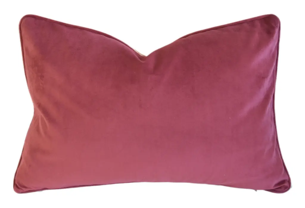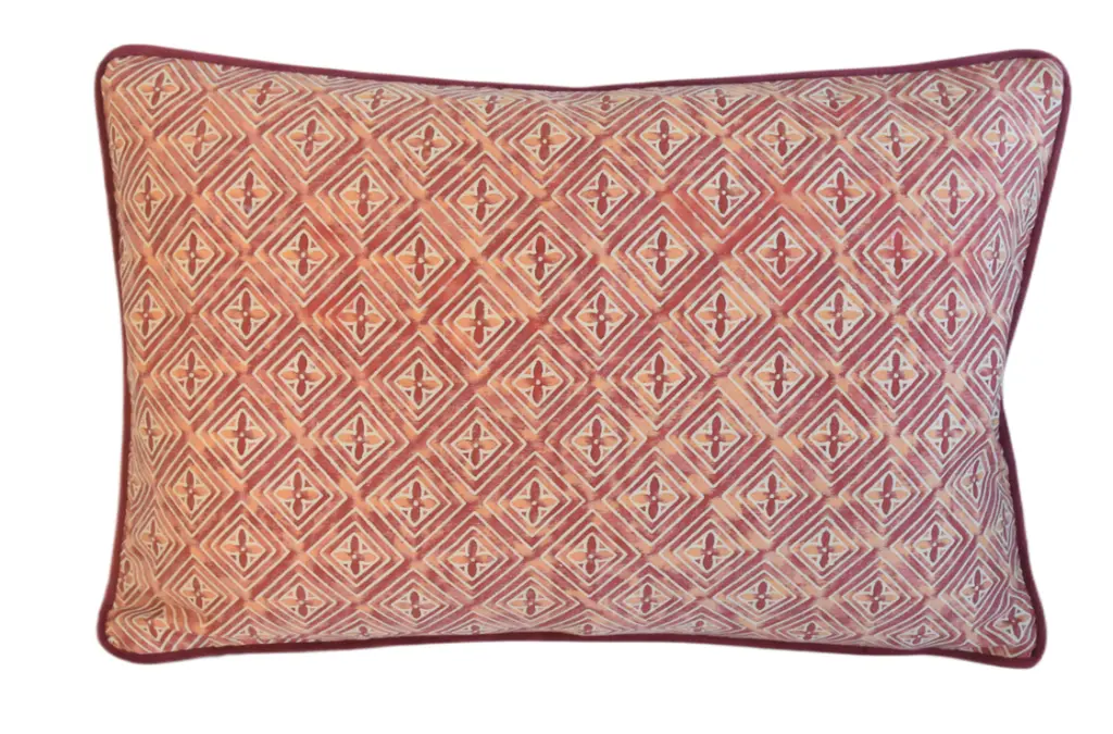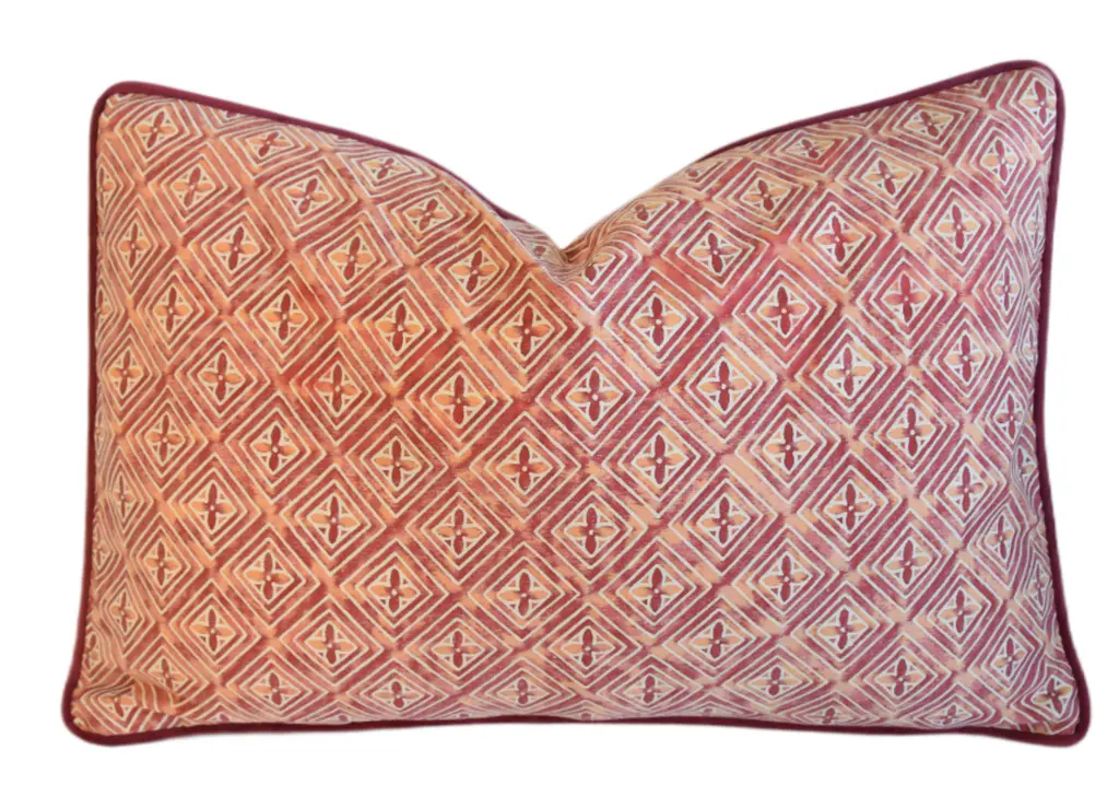 Custom-tailored pillow in Italian Mariano Fortuny cotton fabric, known as "Jupon," featuring a beautiful floral design in a bittersweet and beige colorway. Complementary cotton-velvet back. Custom trim. Zipper closure. Generous plump feather/down insert. Pattern placement may vary according to the fabric cut. Excellent new, unused condition!!