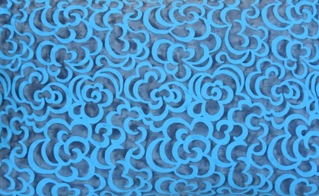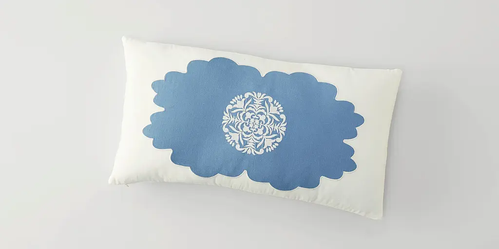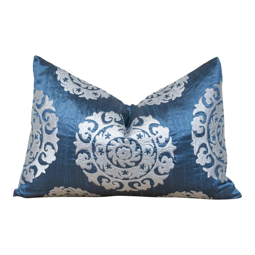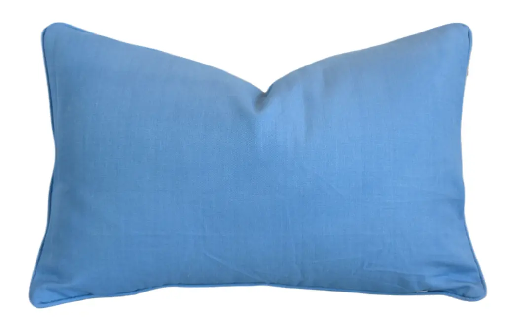 Custom-tailored pillow in Italian designer Mariano Fortuny premium cotton fabric called "Nuvole��� in a stunning Turkish blue color way. Italian for clouds, NUVOLE is a Far Eastern motif from the early 20th century. A symbol of abundance in Chinese culture, clouds are also linked to luck, love, and a union of yin and yang. Blue colored woven linen fabric back. Custom linen cord piping trim. Zipper closure. Generous plump goose feather-and-down insert. Excellent new unused beautiful condition!!!