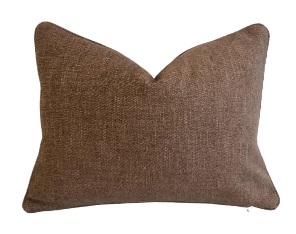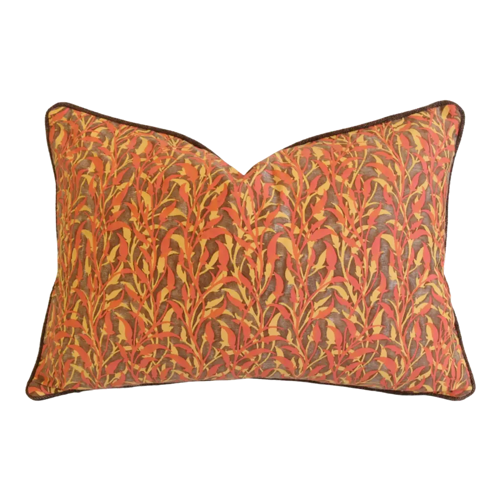 Custom-tailored pillow in Italian Mariano Fortuny cotton fabric called "Orfeo" in a coral, peach and brown coloway. Orfeo, a musician, a poet, and prophet, his contributed to the arts were legendary, even causing some Greek poets to proclaim that his music and singing could charm both flora and fauna into dance. Brown cotton-velvety chenille fabric back. Custom cord piping trim. Invisible zipper closure. Plump generous plump goose down/feather insert. Excellent new unused condition!!!